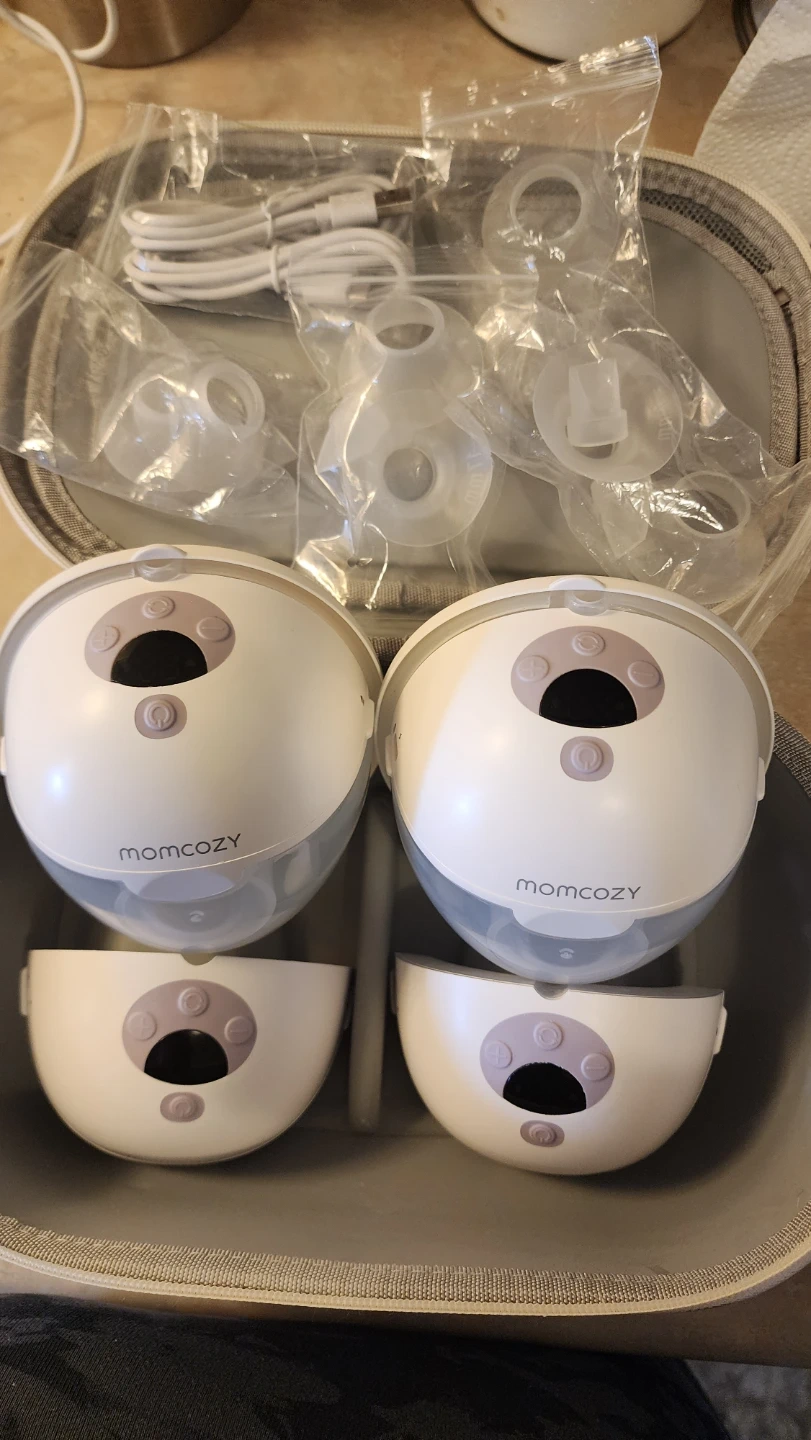 Two Momcozy wearable breast pumps are included in this set. All accessories and the charging cable are also present. The items come in their original carrying case.