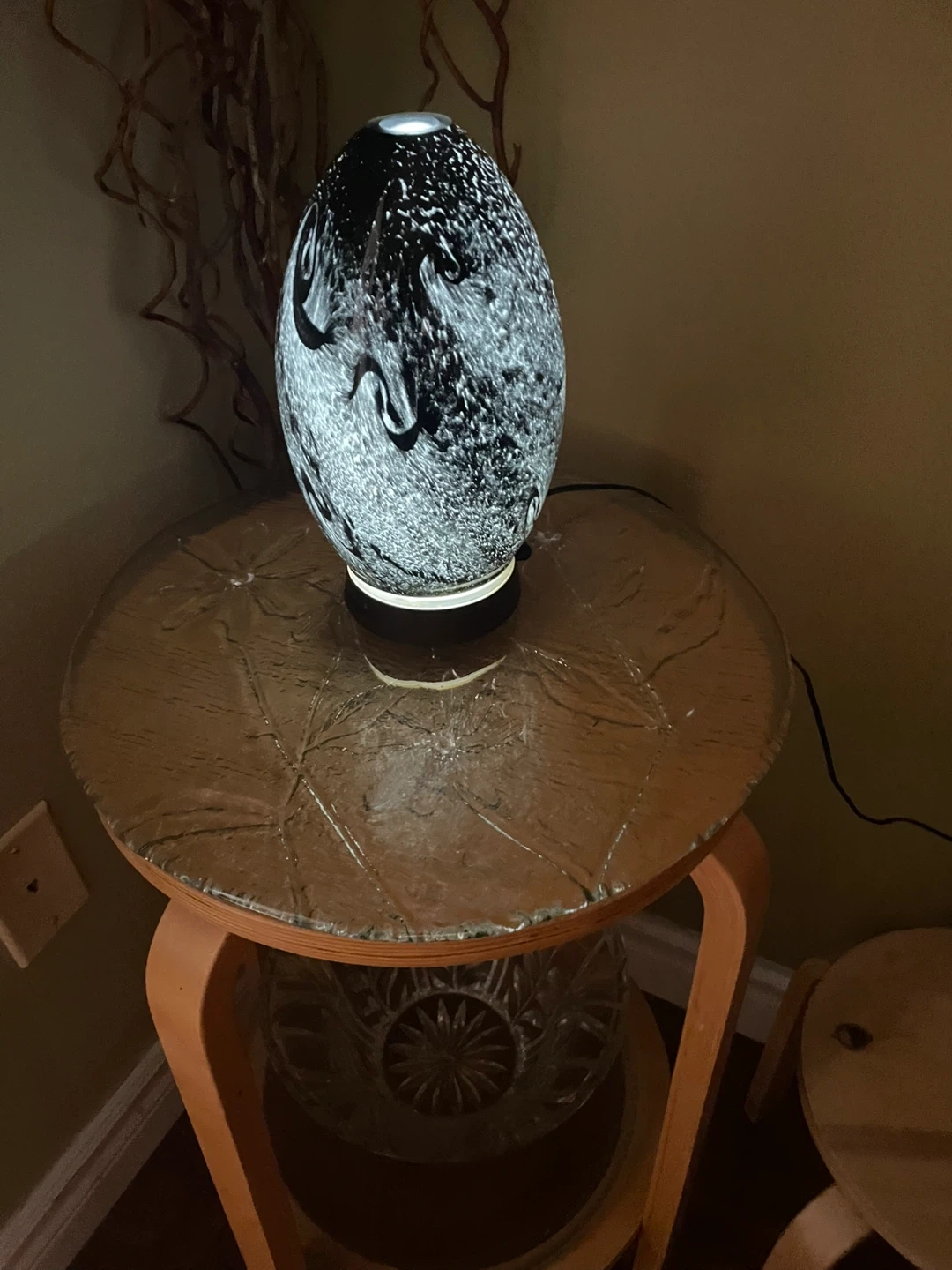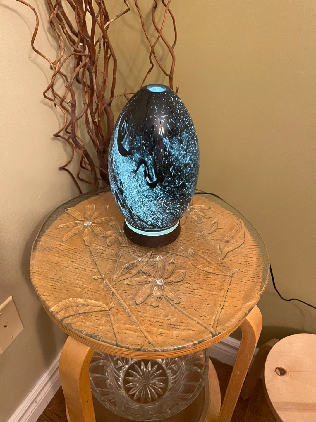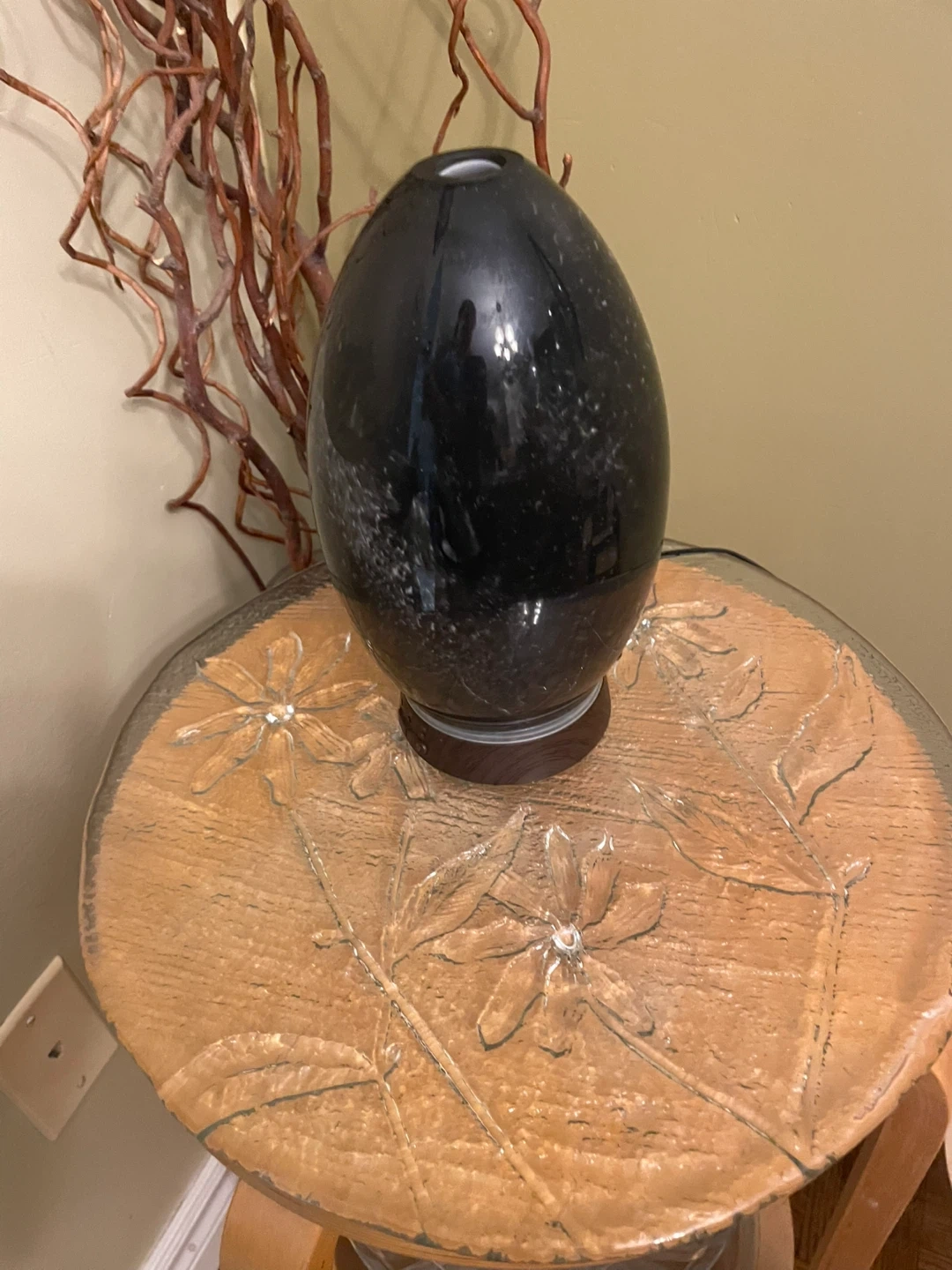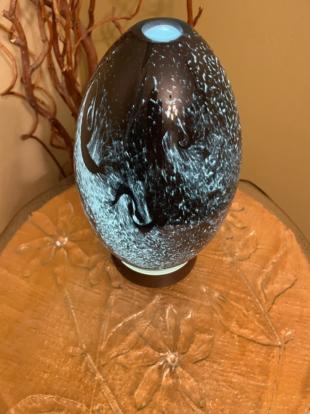 This unique egg-shaped diffuser features a dark, marbled design with swirling accents. It emits a soothing mist and offers adjustable LED lighting options. Great for creating a relaxing atmosphere in any room!