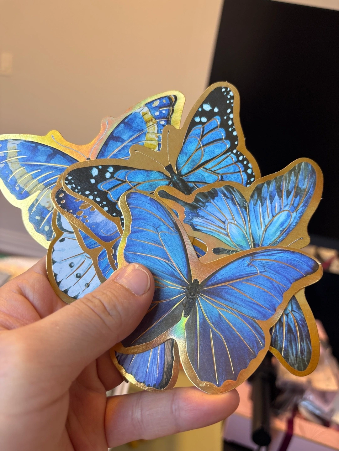 Set of large blue butterfly stickers. Gold foil accents. Part of the Butterfly Diaries series. Perfect for journals, laptops, or planners.