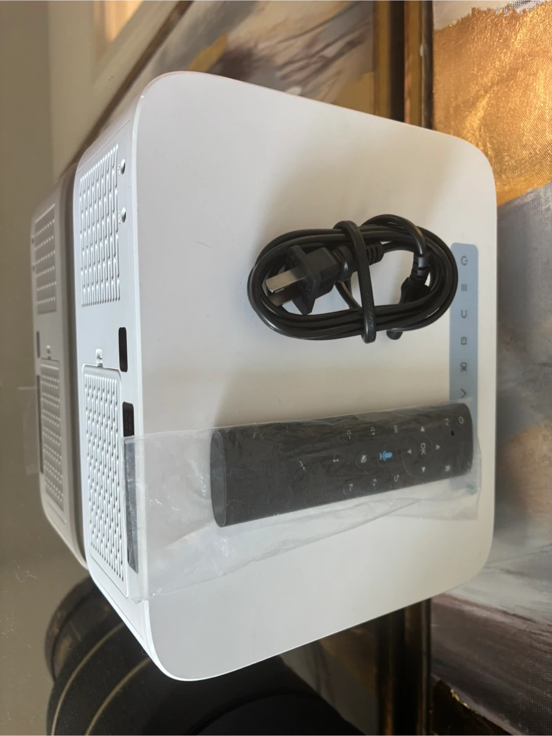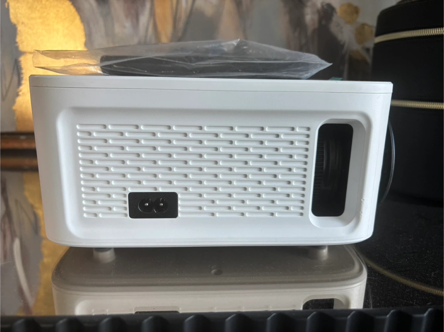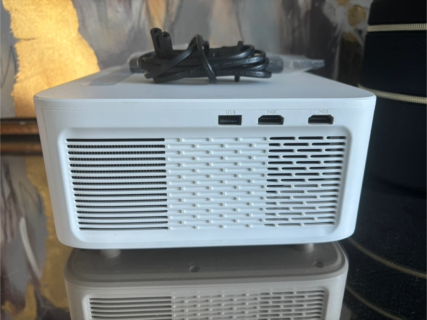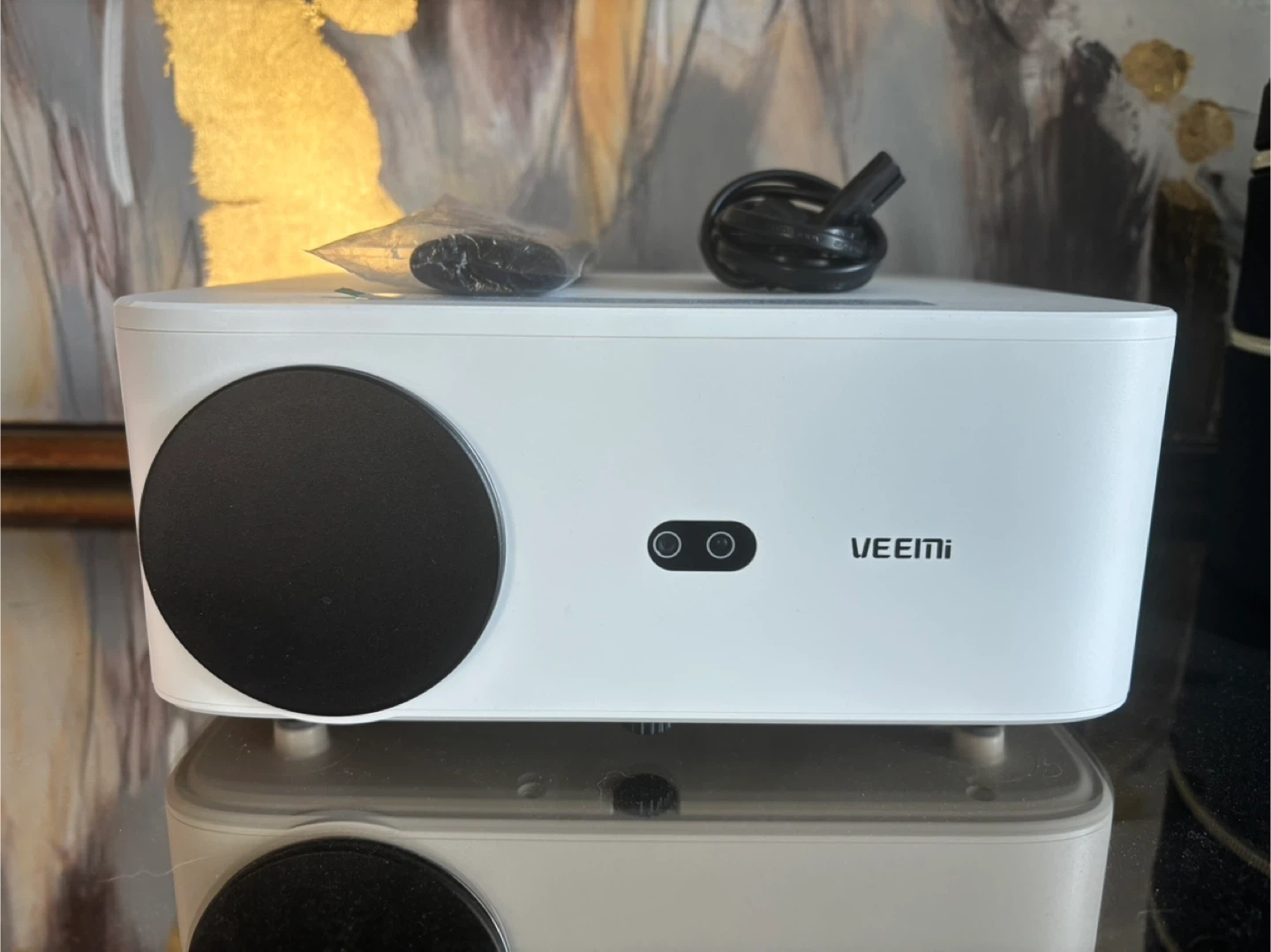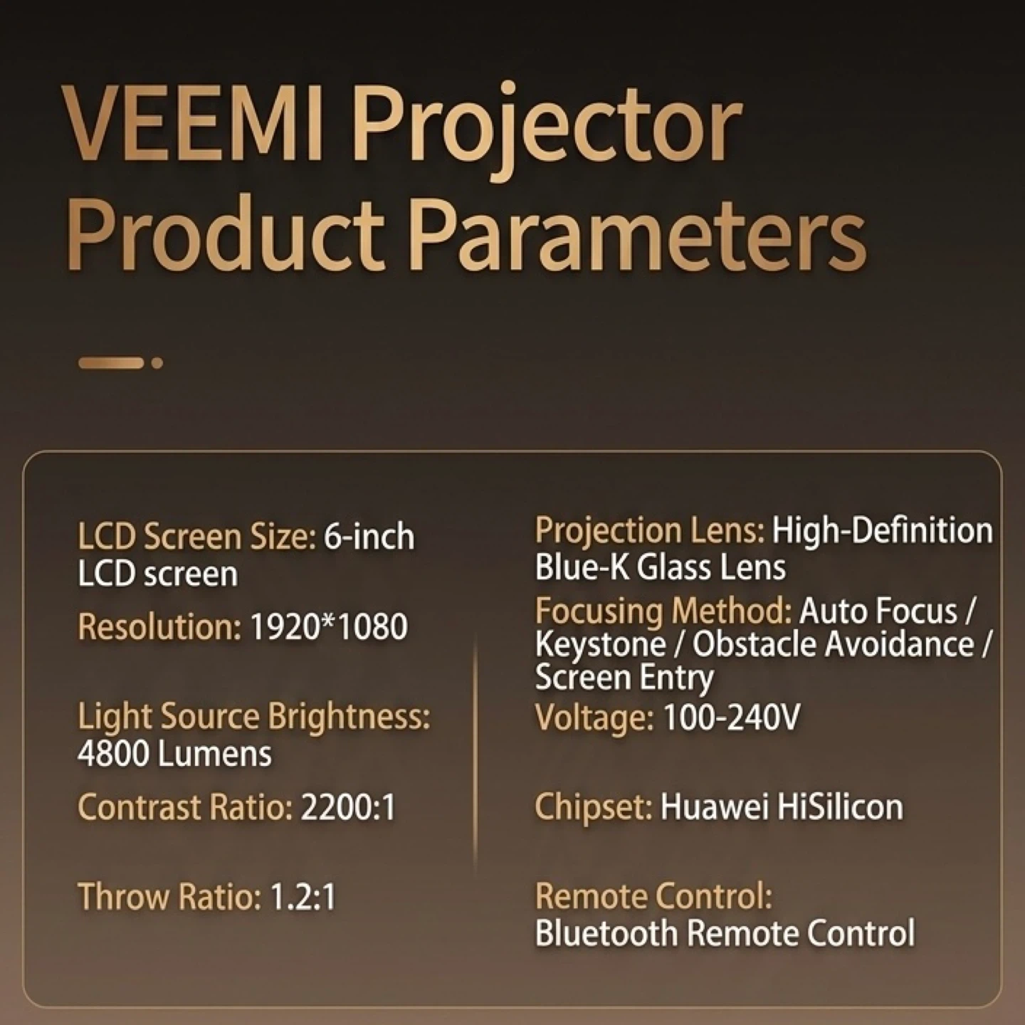 This VEEMI projector features a 6-inch LCD screen with 1920*1080 resolution. It has a light source brightness of 4800 Lumens and a contrast ratio of 2200:1. It also includes a Bluetooth remote control and comes with its power cord. The voltage range is 100-240V.