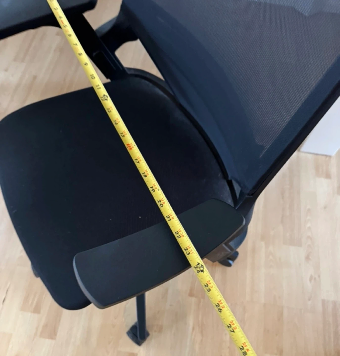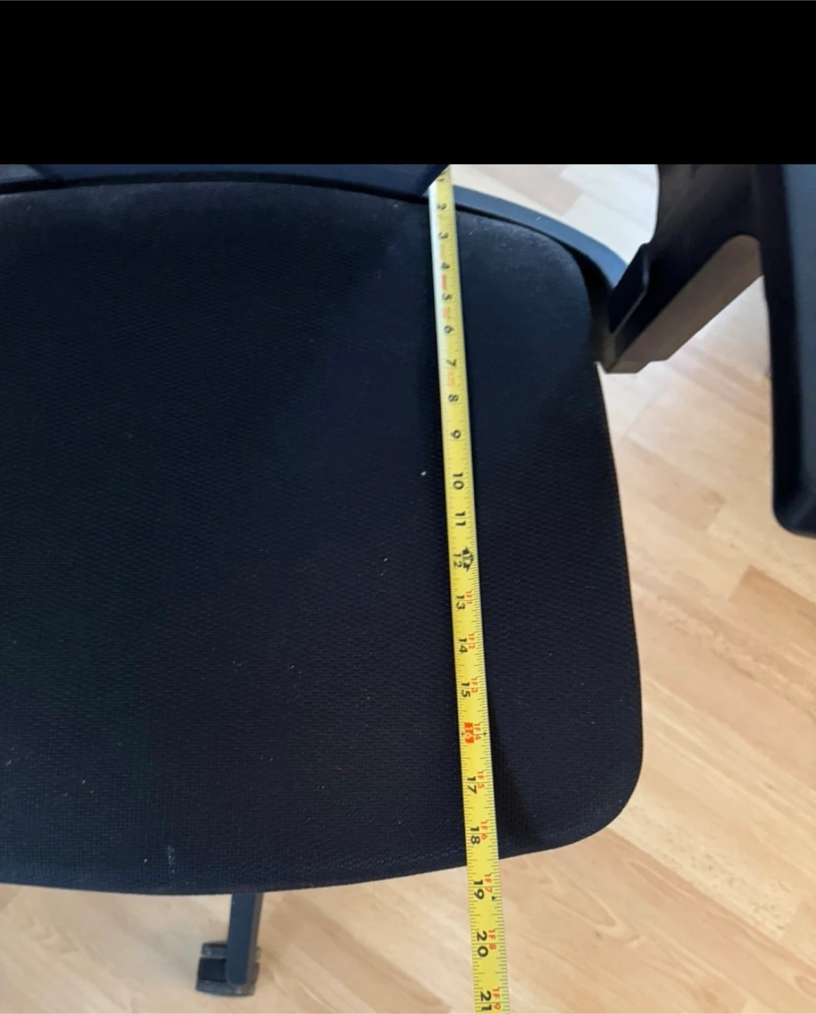This is a black mesh office chair with adjustable seat.