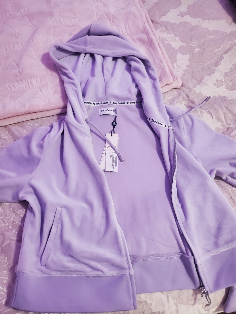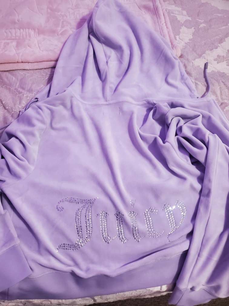 Lavender velour zip-up hoodie. Features rhinestone Juicy Couture logo on the back. Size Large. Brand new with tags.