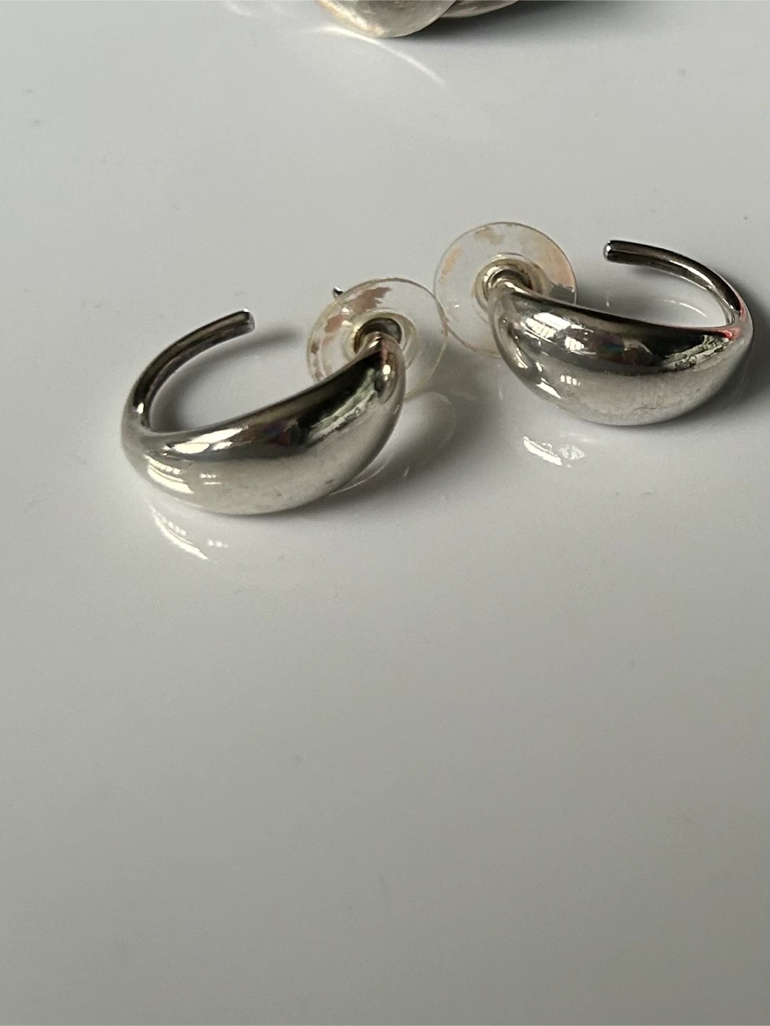 A pair of shiny silver hoop earrings. These have a polished finish and include clear plastic backs. They're a classic shape for everyday wear. Made by Pandora. From the liquid silver collection.
