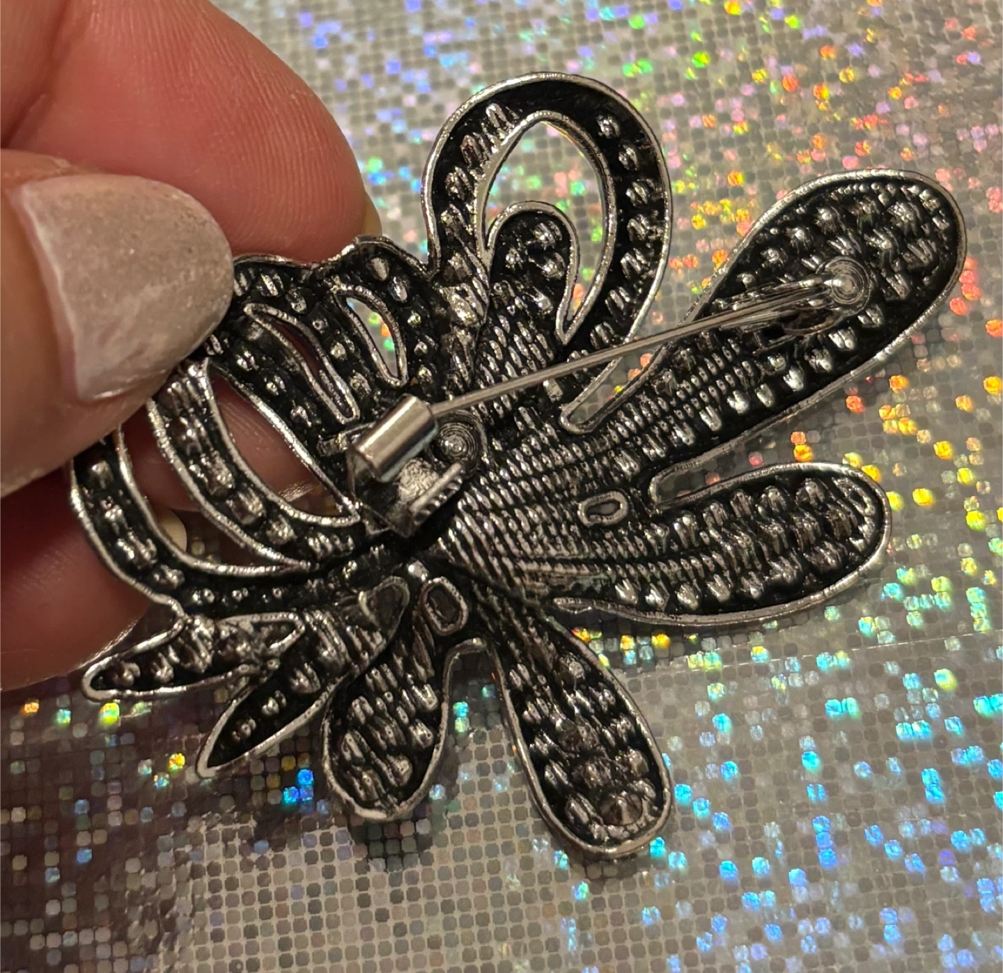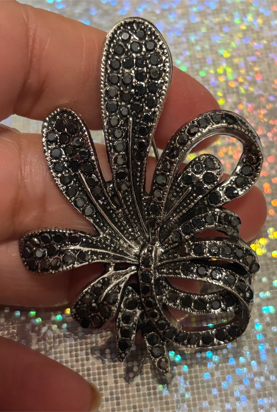 This elegant brooch features a flower design encrusted with small black gems. It's made of a silver-tone metal and fastens with a secure pin closure. It's a lovely accessory to add a touch of sparkle to any outfit!