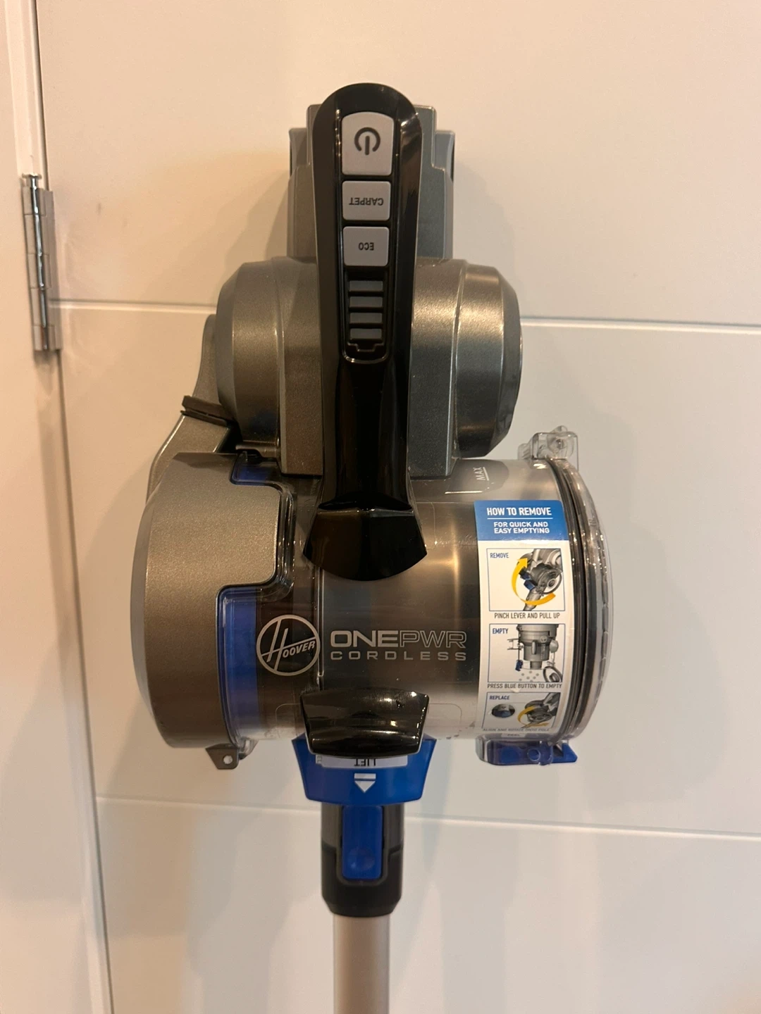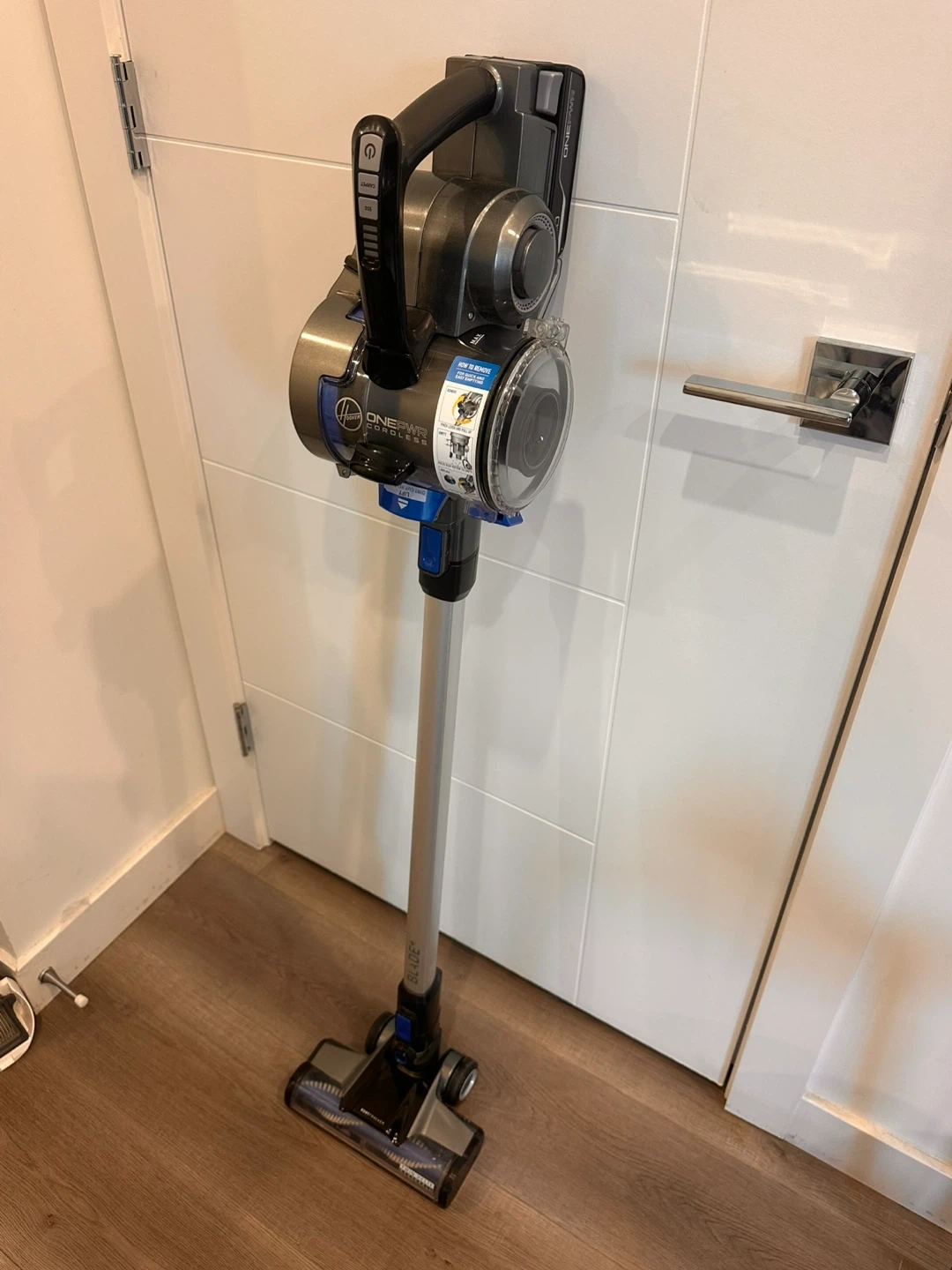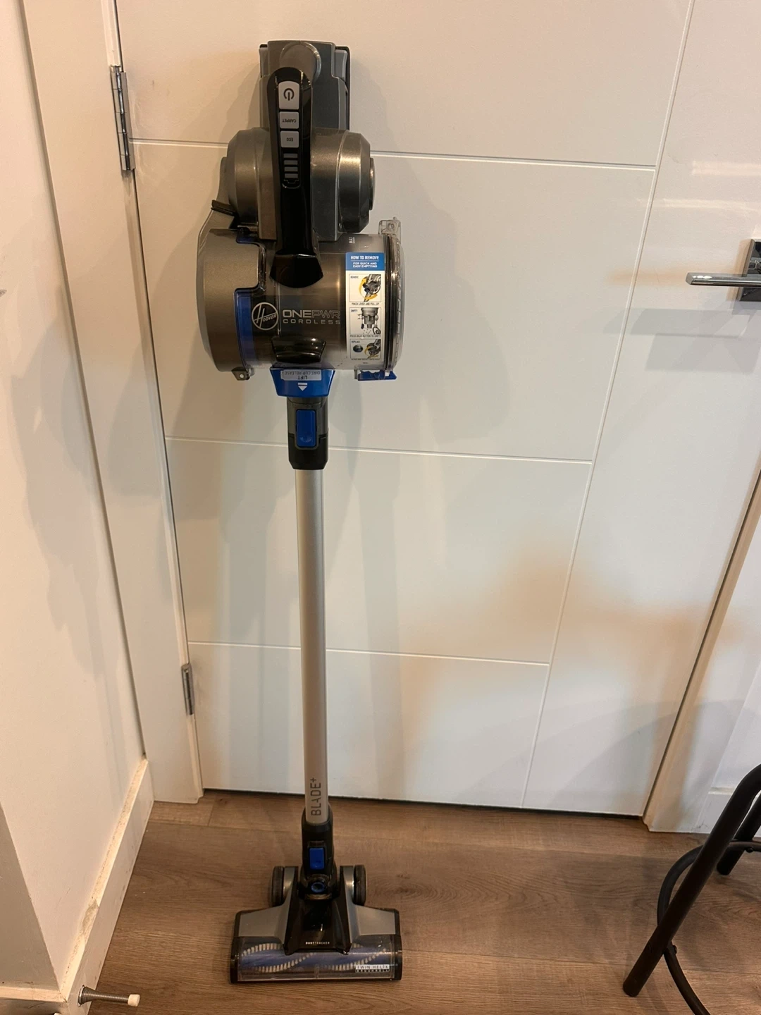 This is a Hoover ONEPWR Blade+ cordless stick vacuum. It's designed for easy cleaning with multiple power settings. The vacuum features a dust tracker and twin helix brush roll for effective dirt pickup.