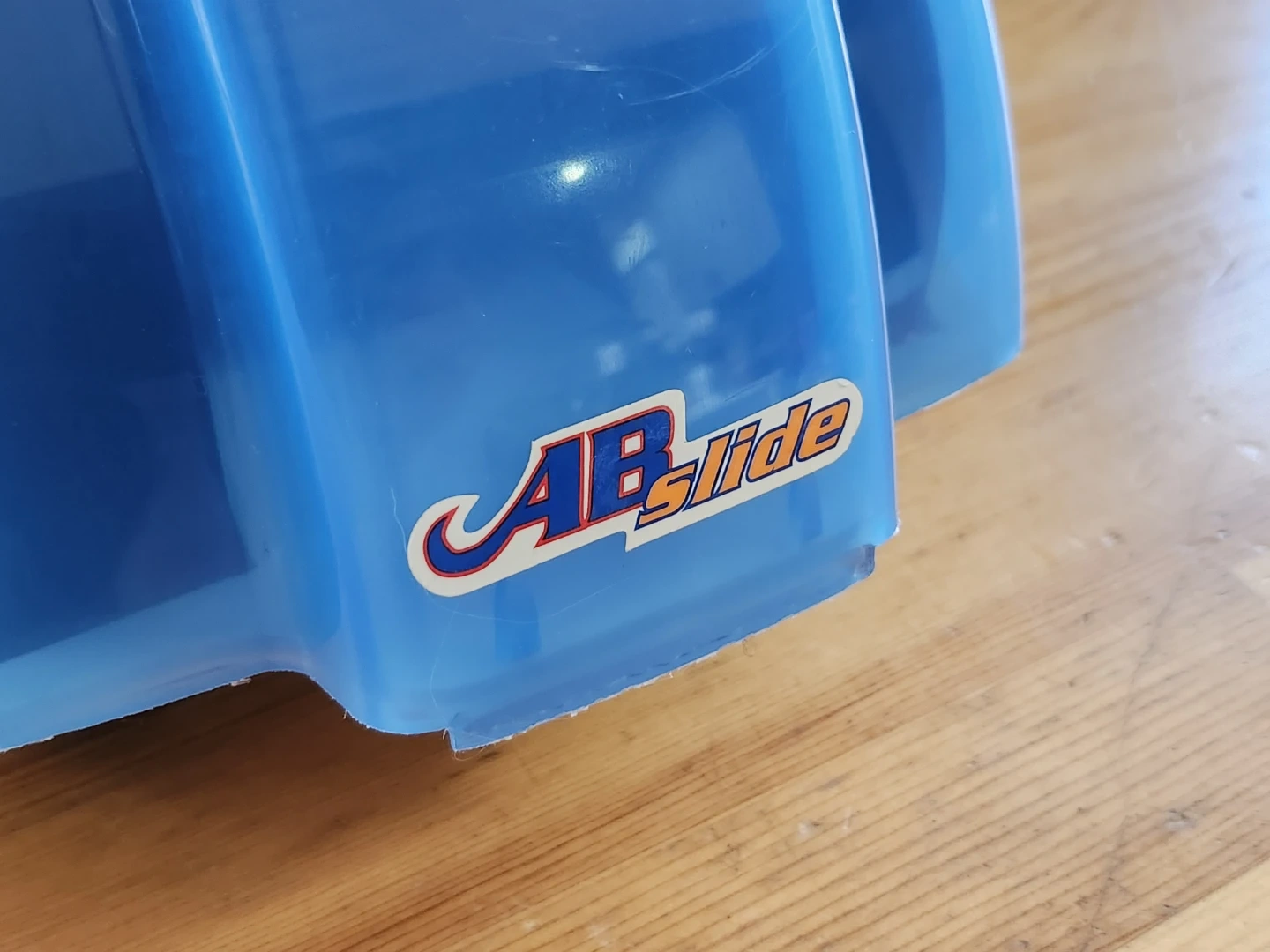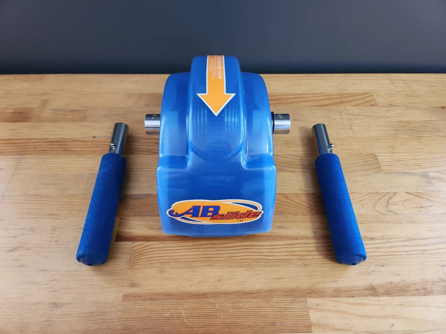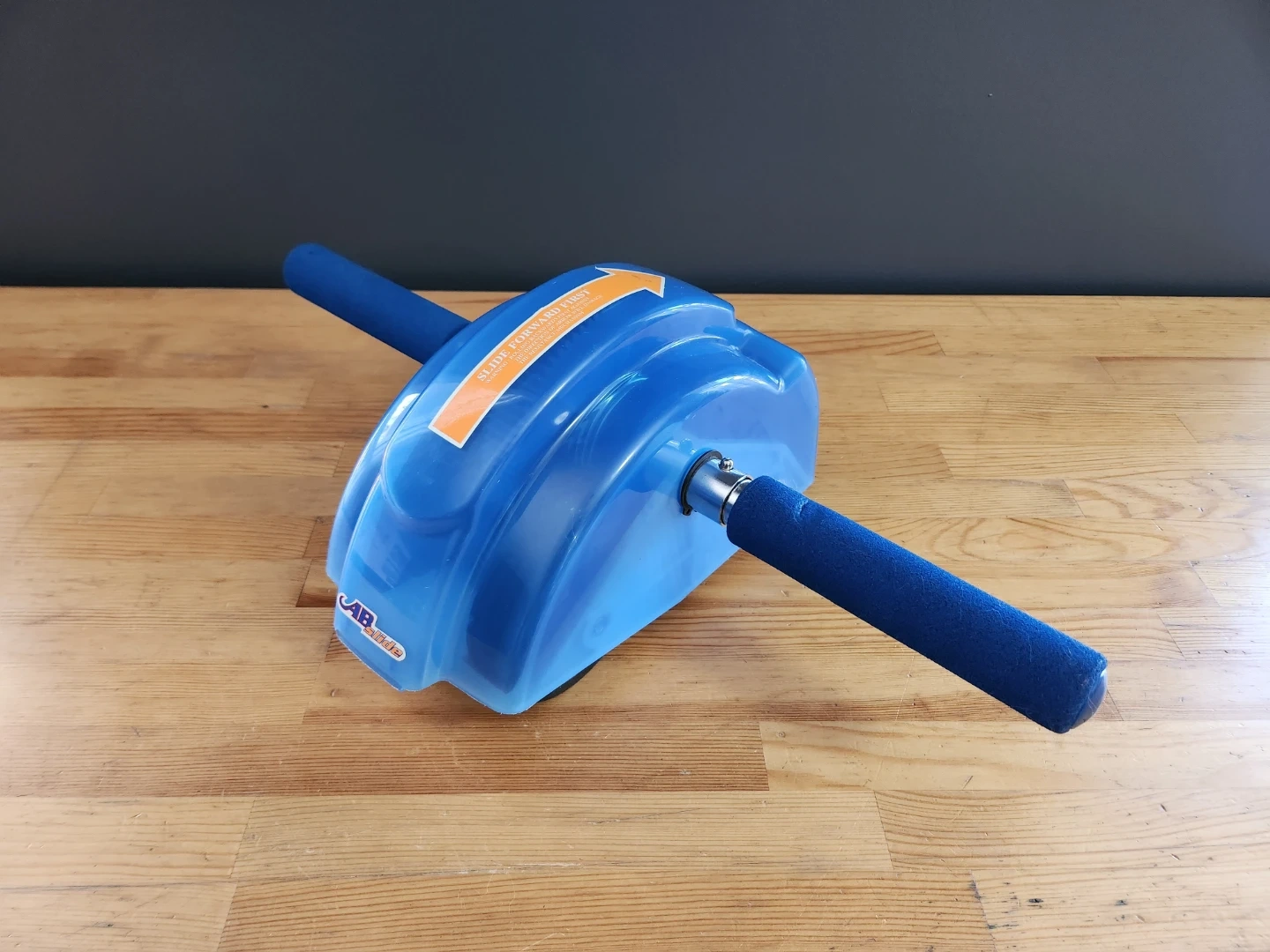 This device is The Original Ab Slide, an abdominal roller designed for home core and upper body workouts. It features a blue plastic casing with an orange directional arrow and foam-covered handles for a comfortable grip.