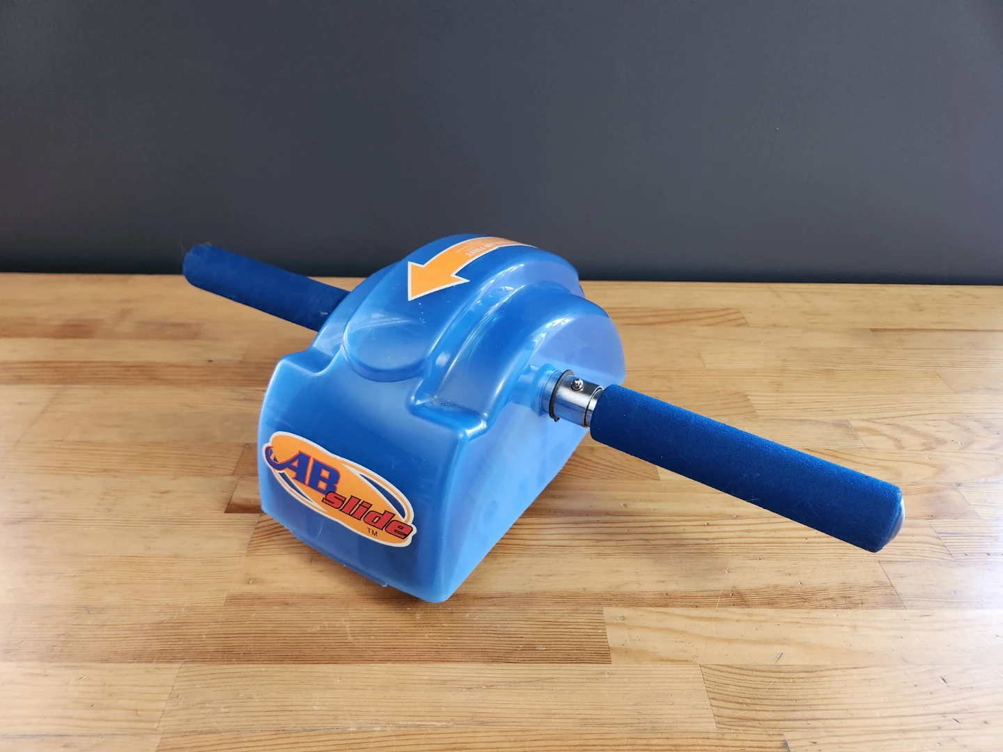 This device is The Original Ab Slide, an abdominal roller designed for home core and upper body workouts. It features a blue plastic casing with an orange directional arrow and foam-covered handles for a comfortable grip.