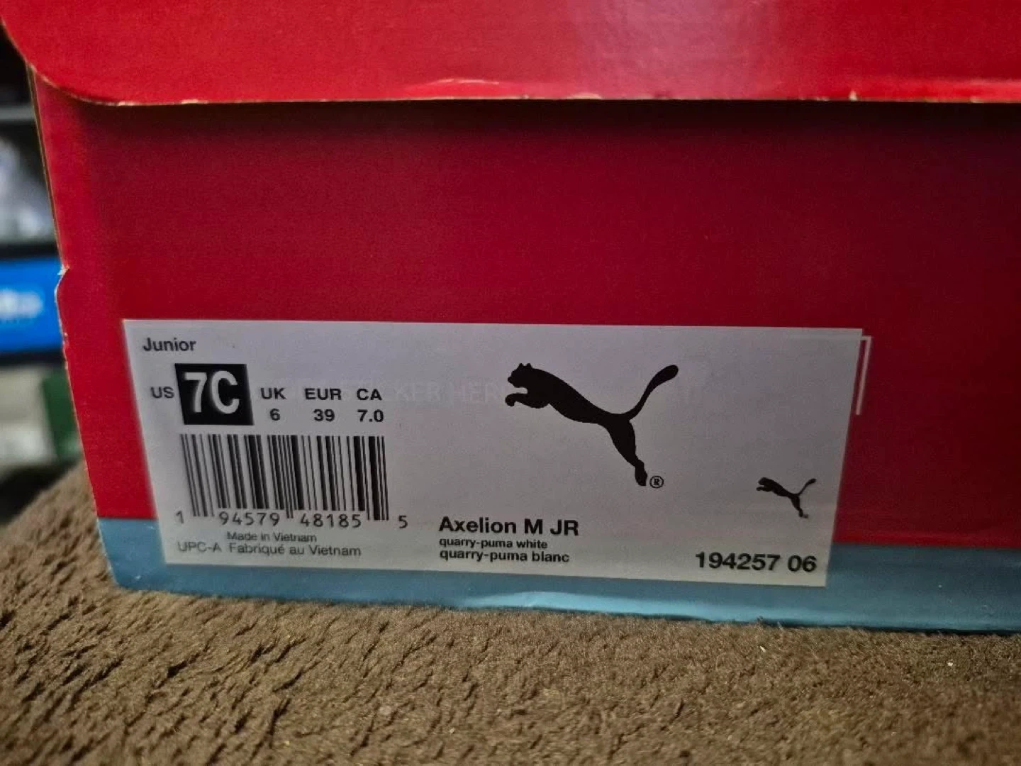 These are Puma Axelion M JR running shoes in a grey colour. They're a junior size 7C. These shoes feature a mesh upper for breathability. They're great for kids who are active!