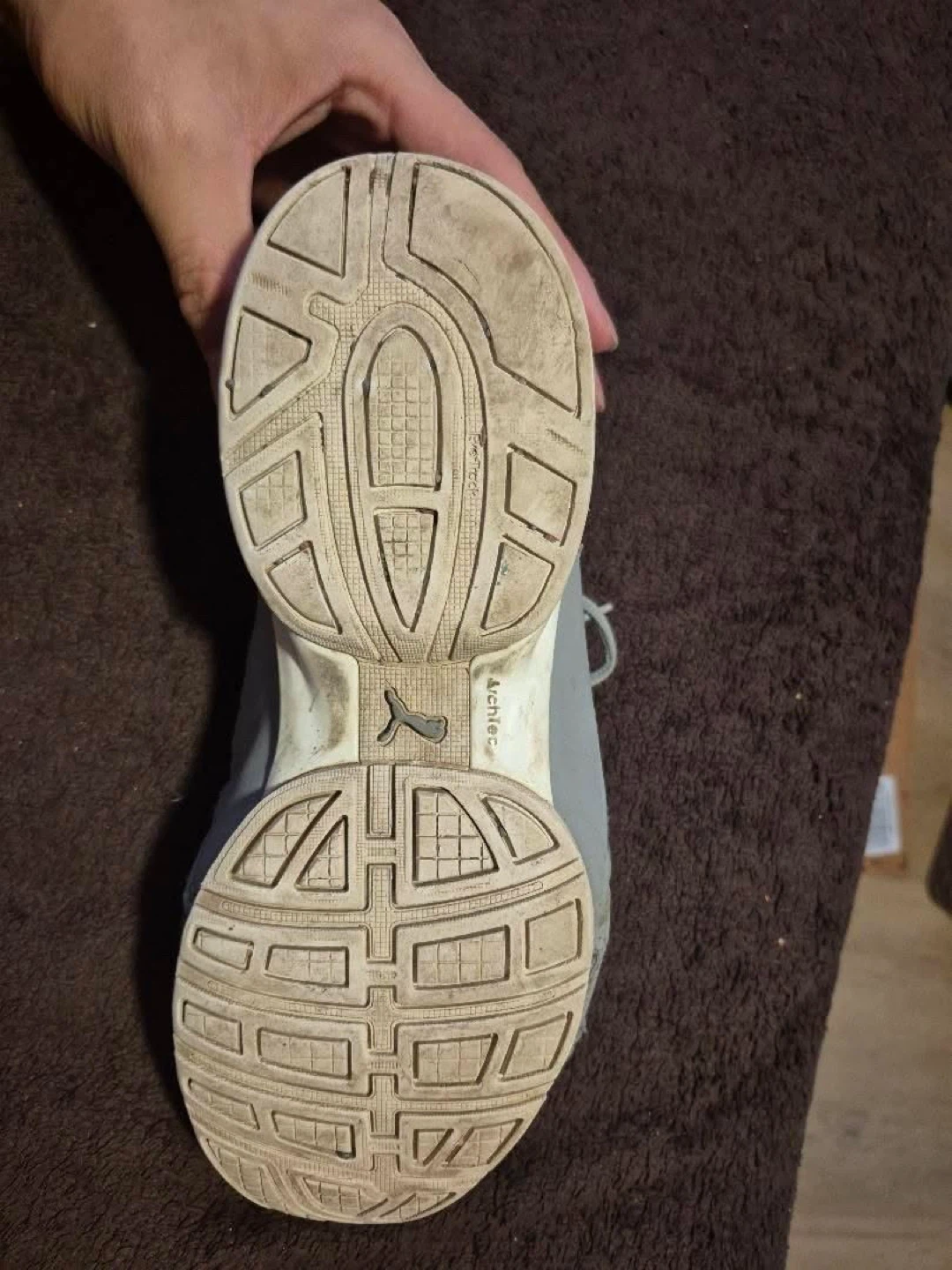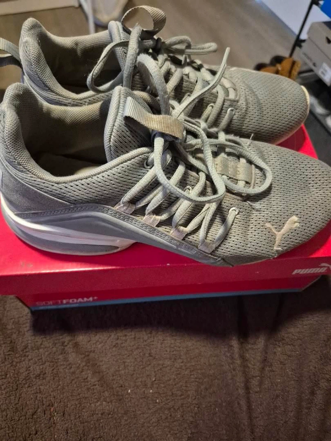 These are Puma Axelion M JR running shoes in a grey colour. They're a junior size 7C. These shoes feature a mesh upper for breathability. They're great for kids who are active!