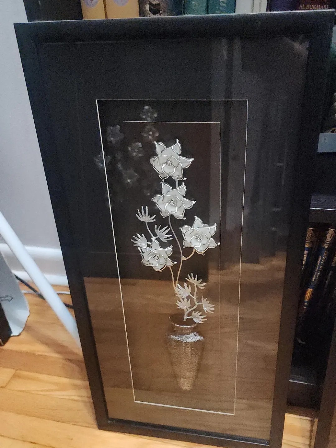 Here's a lovely framed piece of wall art featuring a floral design. The frame is black and the floral design is a silvery colour. It's in great condition and ready to brighten up any room!