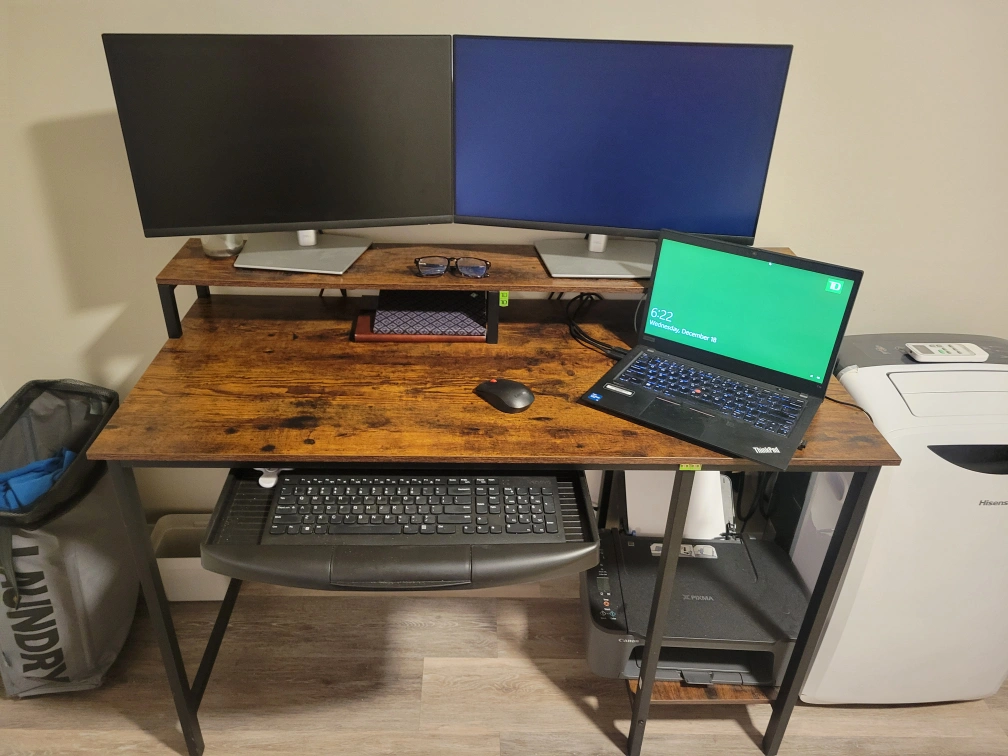 Computer desk with a pull out keyboard tray. Two shelves for storage. Black frame with a brown wood top.