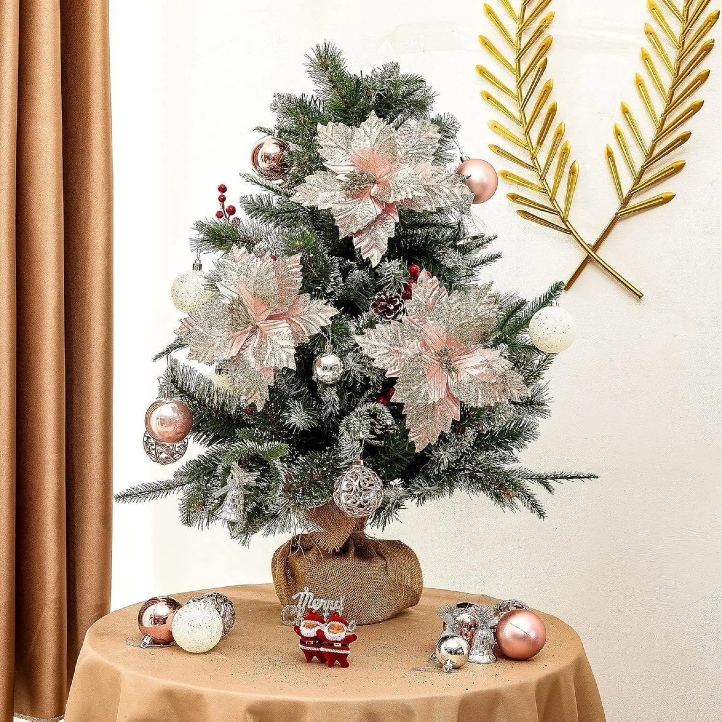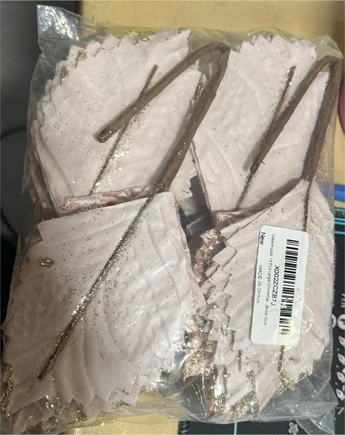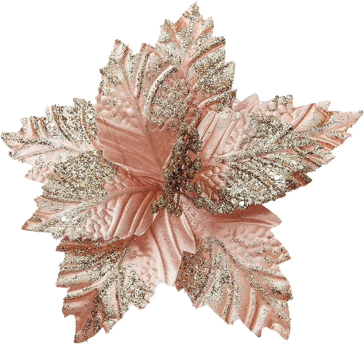 Selling a set of 10 Greenzla large glitter rose gold artificial flowers! They're brand new in the package and ready to add some sparkle to your holiday decor