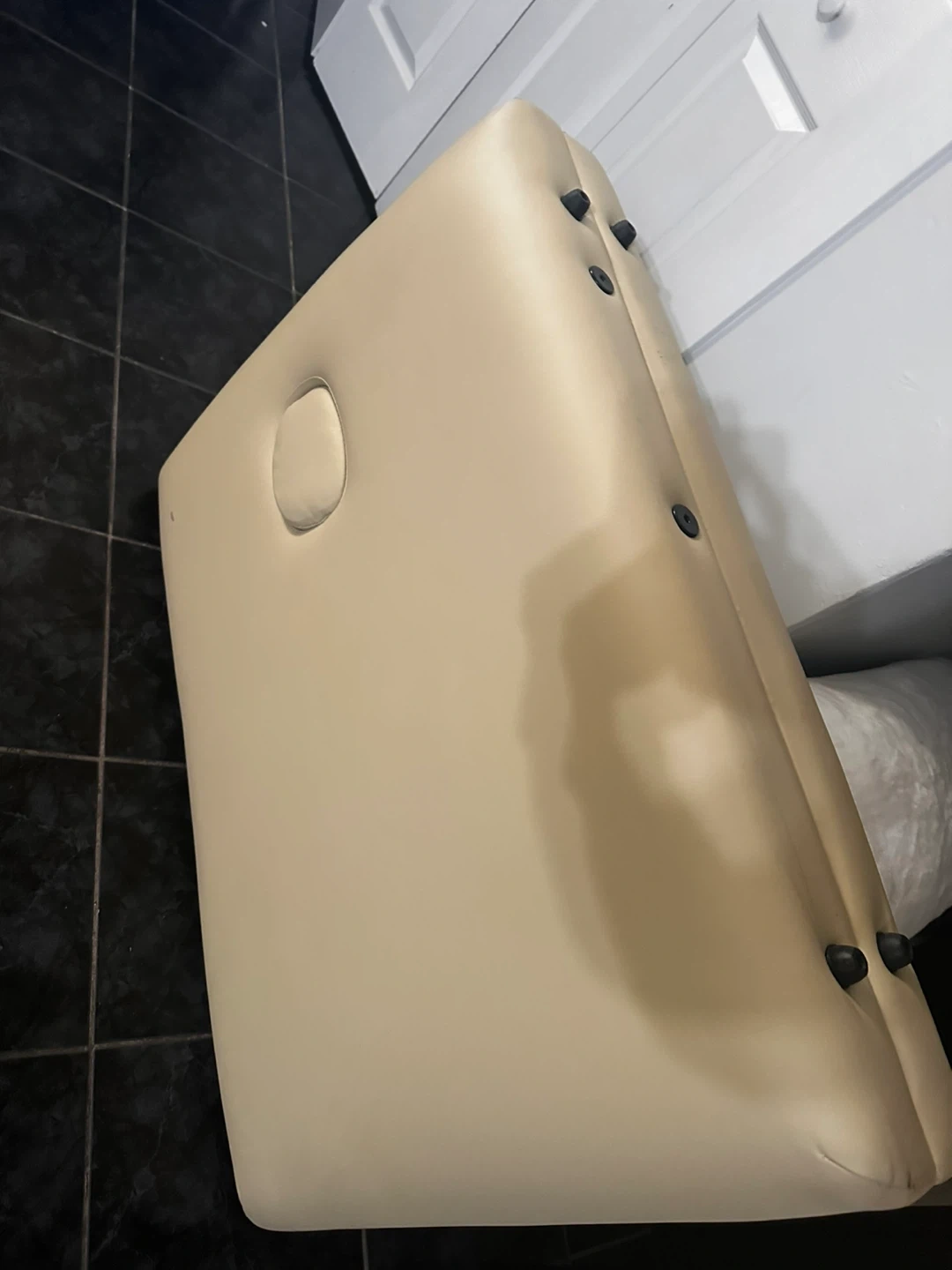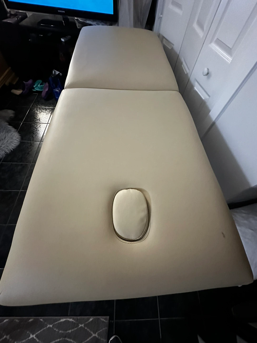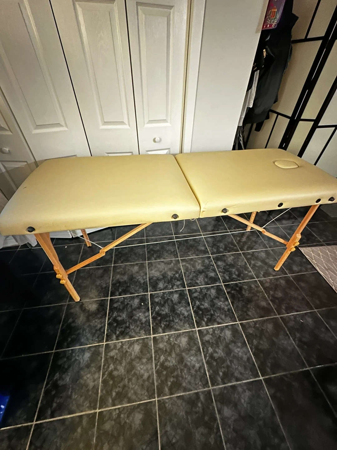 This is a portable massage table. It's beige and has an opening for resting the face. The wooden legs are height adjustable. It's a sturdy table, ideal for professional or home use.