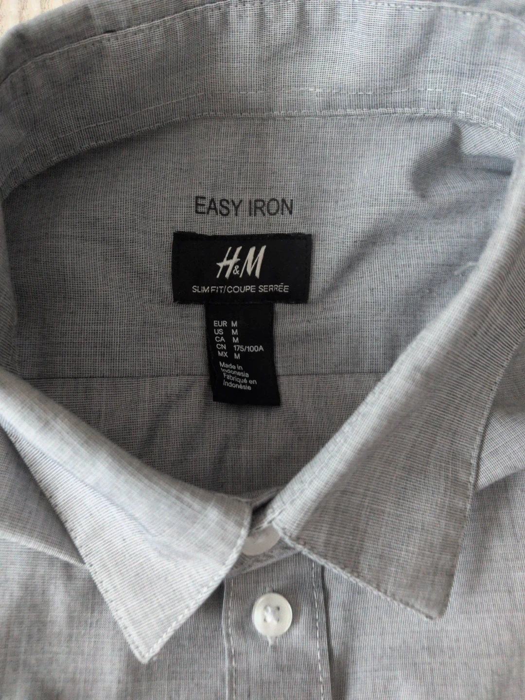 This is an H&M men's long-sleeved button-up shirt in a grey colour. It's a slim fit with an "Easy Iron" finish, making it simple to keep looking sharp. Made from a cotton blend. Size is medium.