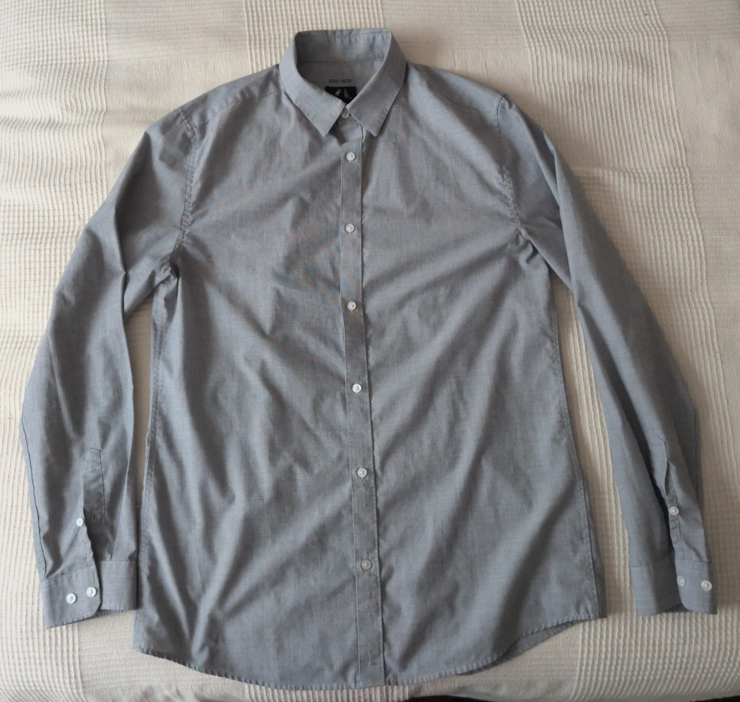 This is an H&M men's long-sleeved button-up shirt in a grey colour. It's a slim fit with an "Easy Iron" finish, making it simple to keep looking sharp. Made from a cotton blend. Size is medium.