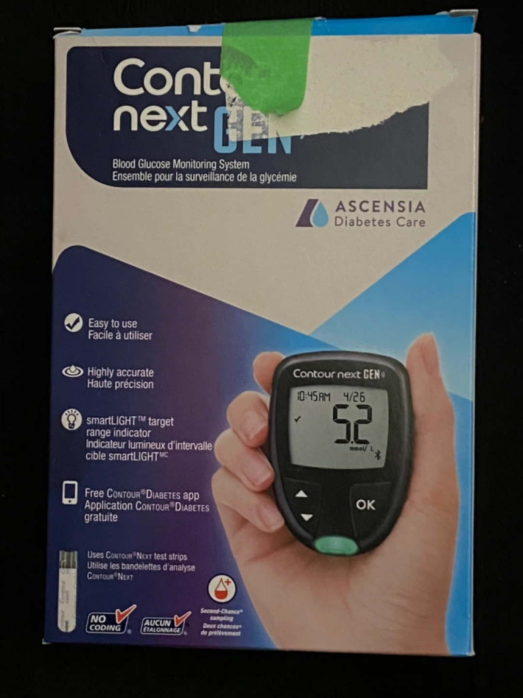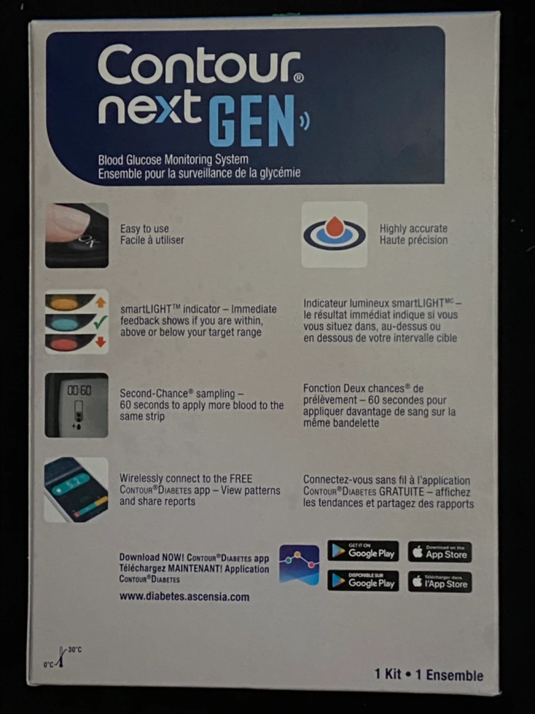This is a Contour Next Gen blood glucose monitoring system. It's easy to use and highly accurate. It features a smartLIGHT target range indicator and Second-Chance sampling. Wireless connection to the FREE Contour Diabetes app is included.