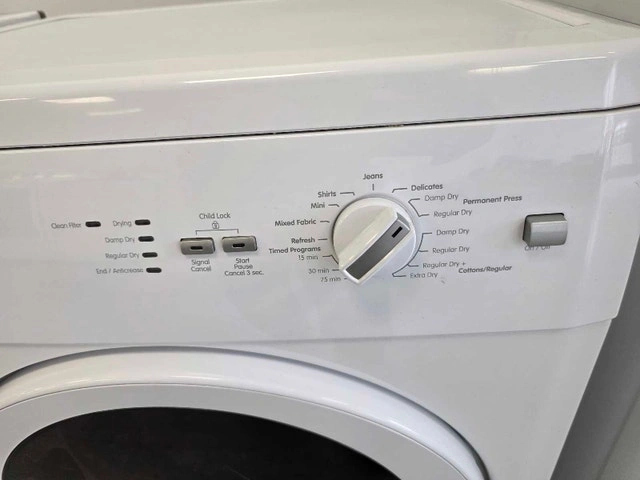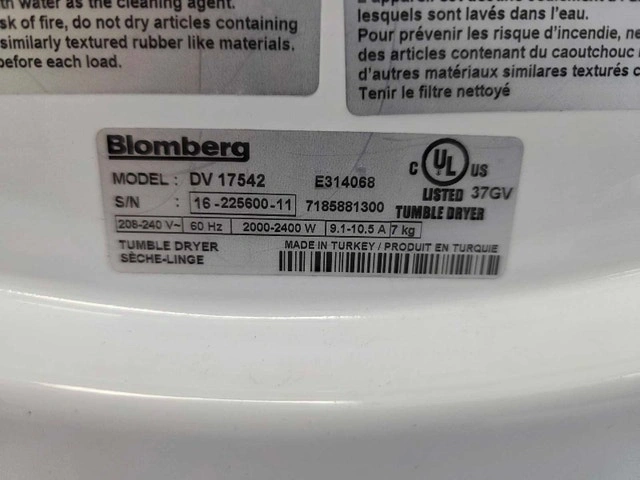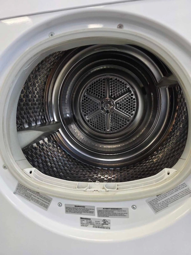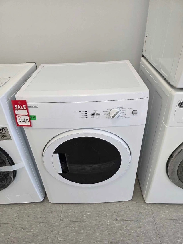DRYER – Blomberg DV17542 • 24" compact – perfect for condos & small spaces • 3.67 cu. ft. capacity • 15 drying cycles | 4 temperature settings • Automatic sensor drying (no over-drying) • Stainless steel drum | Glass door • Stackable design • Clean filter light • Vented electric (240V) Feel free to message if you have any questions!