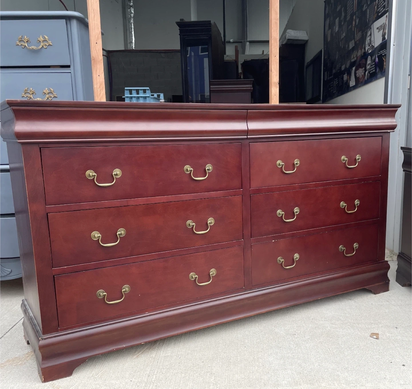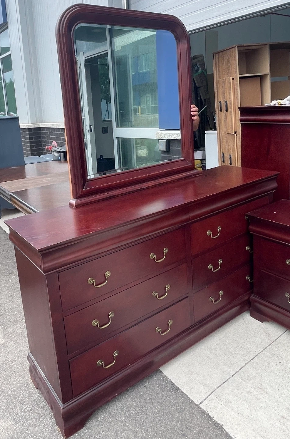 This dresser features a rich cherry wood finish and six spacious drawers. It includes a matching mirror with a curved top. Solid wood construction ensures durability.