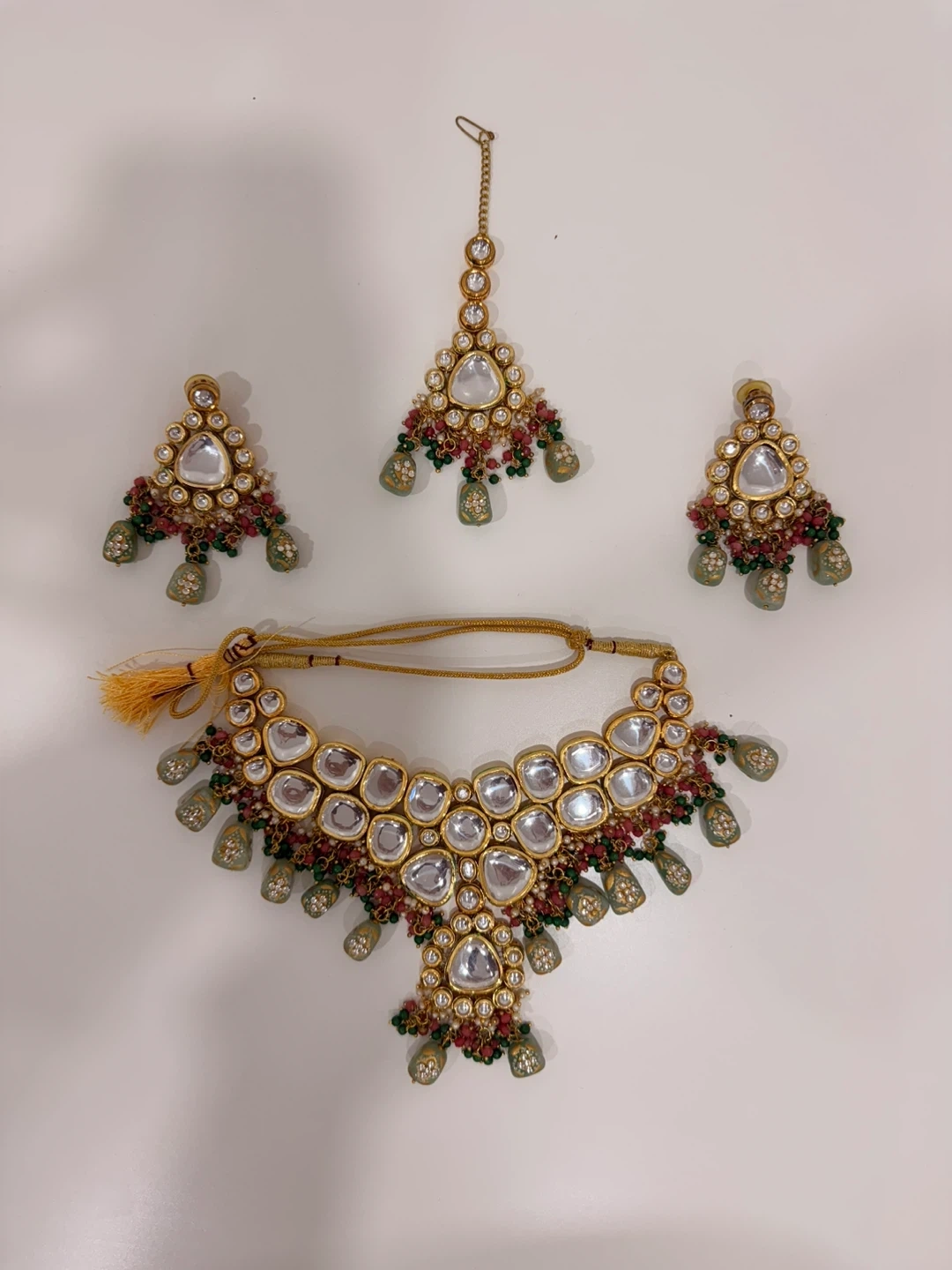 Beautiful Indian jewellery set featuring a Kundan necklace, matching earrings, and a tikka. With clear stones, red and green beads, and delicate pearls. The gold toned metal has intricate painted details. Perfect for special occasions.