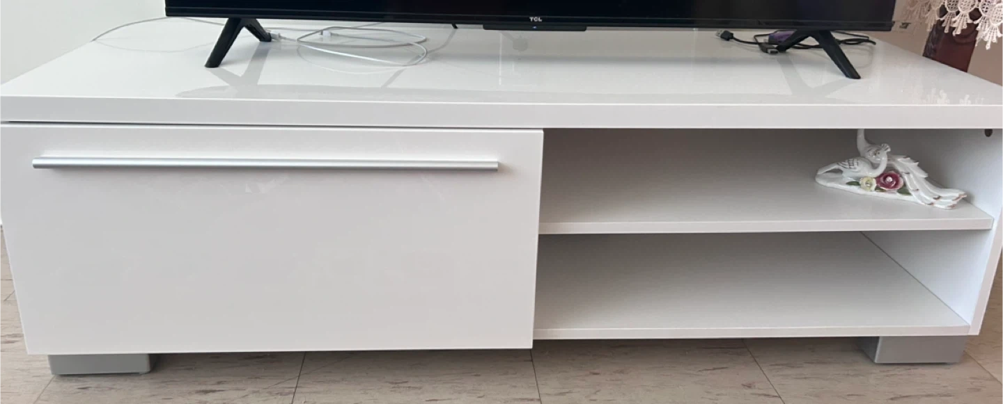 Modern white TV stand featuring a smooth, large drawer with a silver handle and two open shelves. It's made from a glossy material and has a clean, minimalist design. Perfect for organizing your entertainment setup! Price is negotiable.