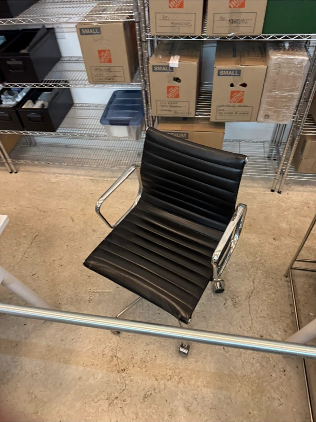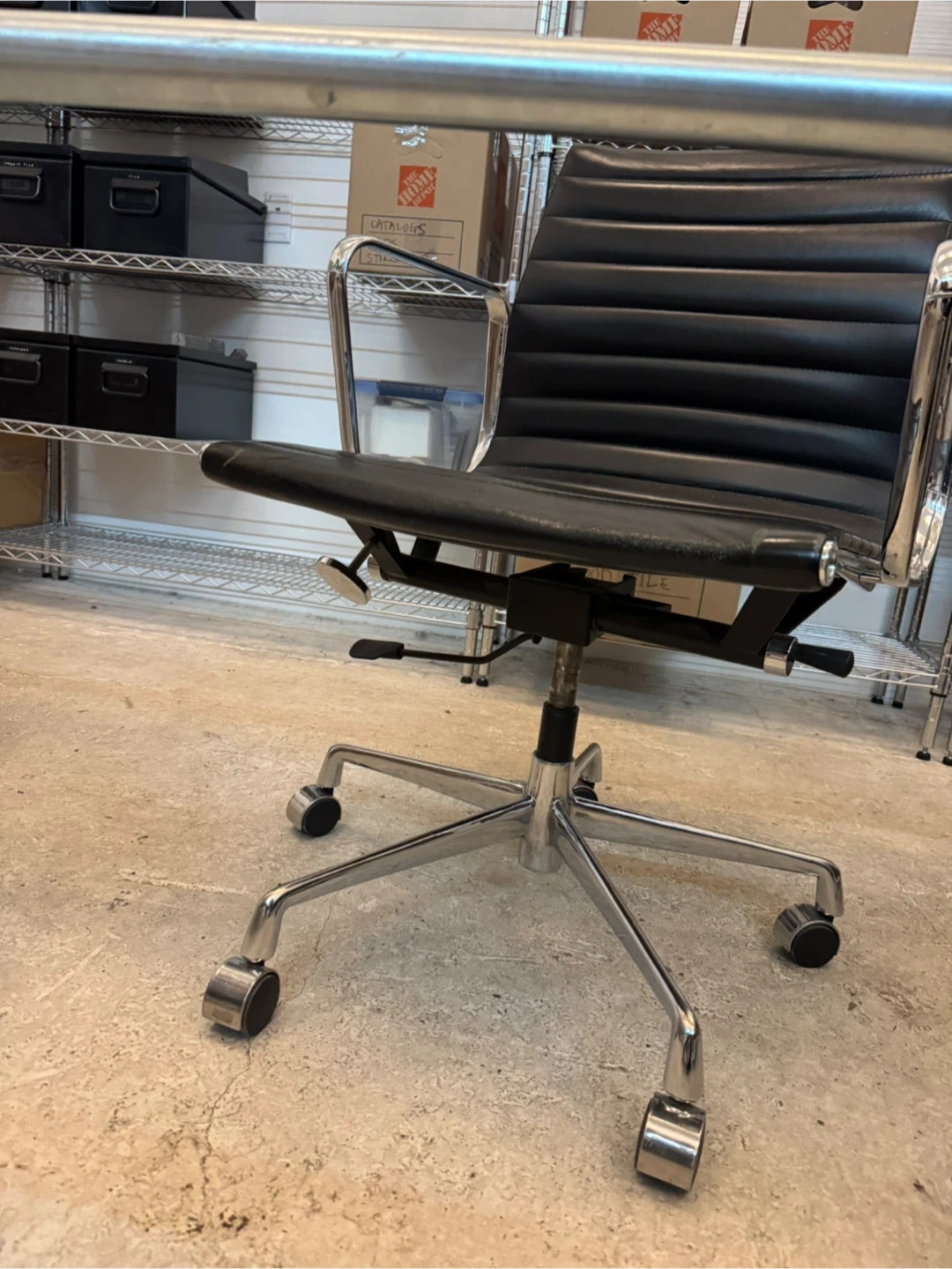 Eames design with chrome and black leather. It's a comfortable and stylish addition to any workspace. The chair has a durable leather upholstery and a sturdy base with wheels for easy mobility. Shows use, great condition and very stylish. Adjustments to go up and down, and lounge back. I have 3 in total, priced per chair