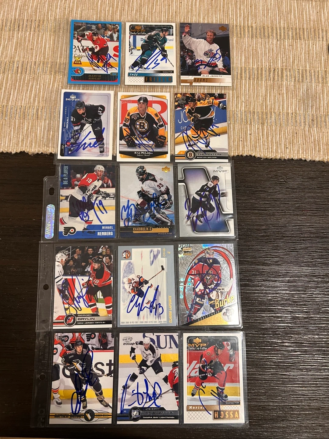 This lot features autographed hockey cards of various players. Signatures are visible on each card. It's a great find for any hockey card collector! All cards are $10 except for Joe Thornton which is selling for $20!!
