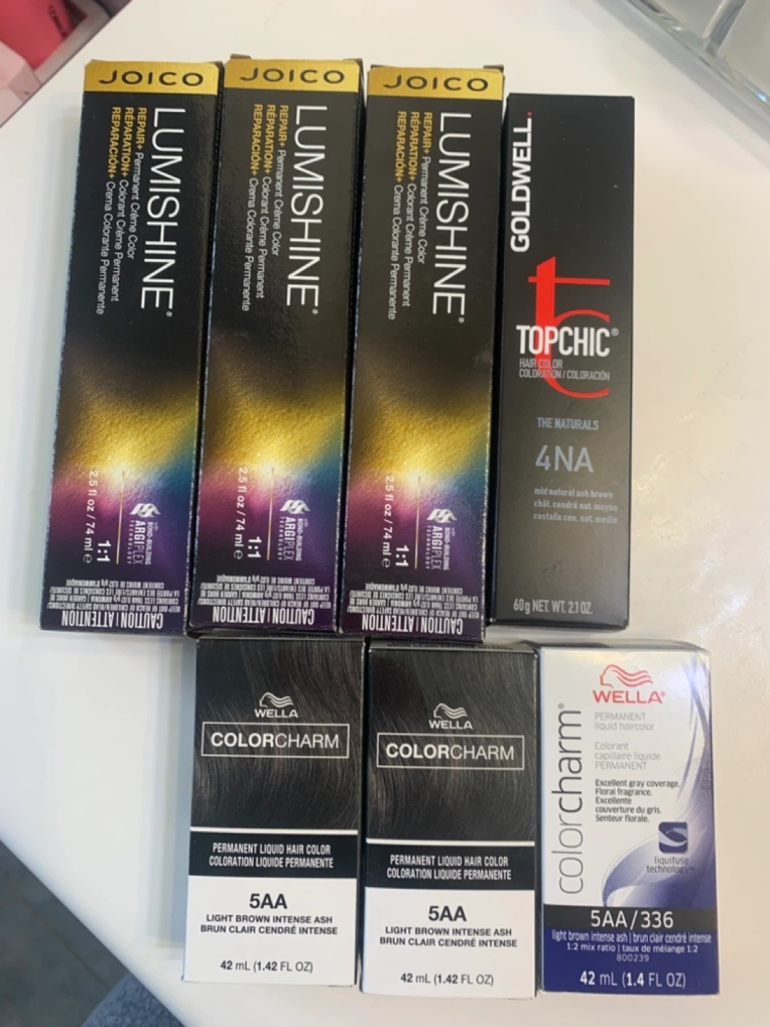This lot includes three boxes of Joico Lumishine permanent crème color, one box of Goldwell Topchic permanent hair color in 4NA, and two boxes of Wella Colorcharm permanent liquid hair color in 5AA. Each Joico box contains 2.5 fl oz / 74 mL. The Wella Colorcharm boxes contain 42 mL (1.42 FL OZ) each, and the Wella colorcharm box contains 42 mL (1.4 FL OZ). These are for professional hair coloring use. Price is per box.