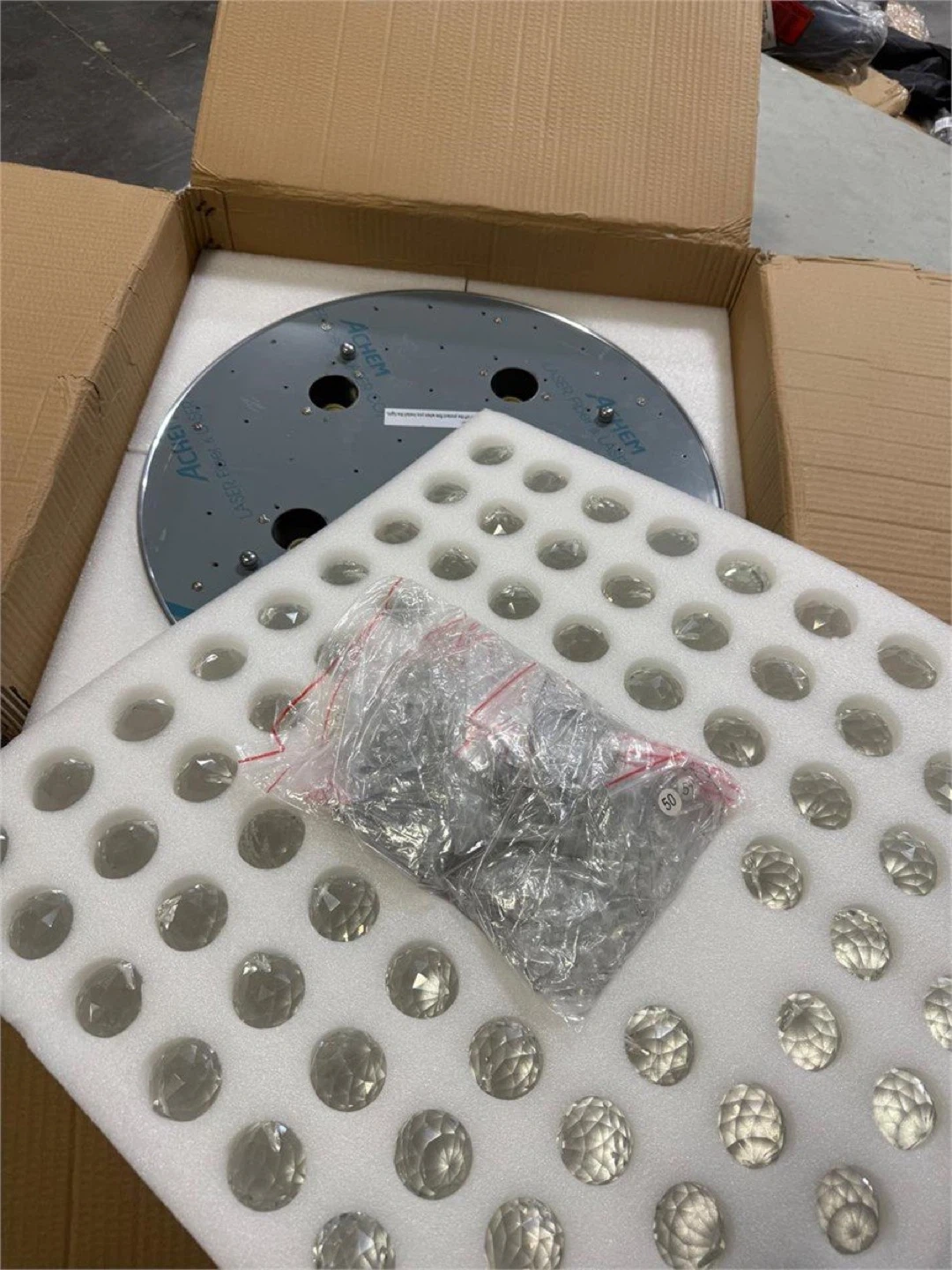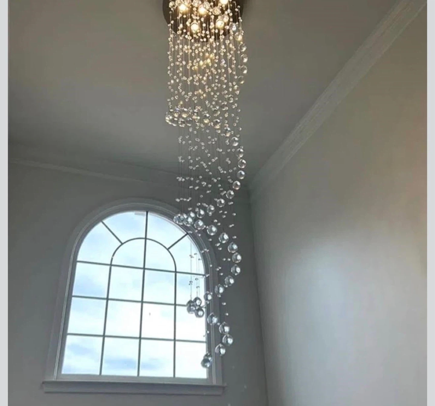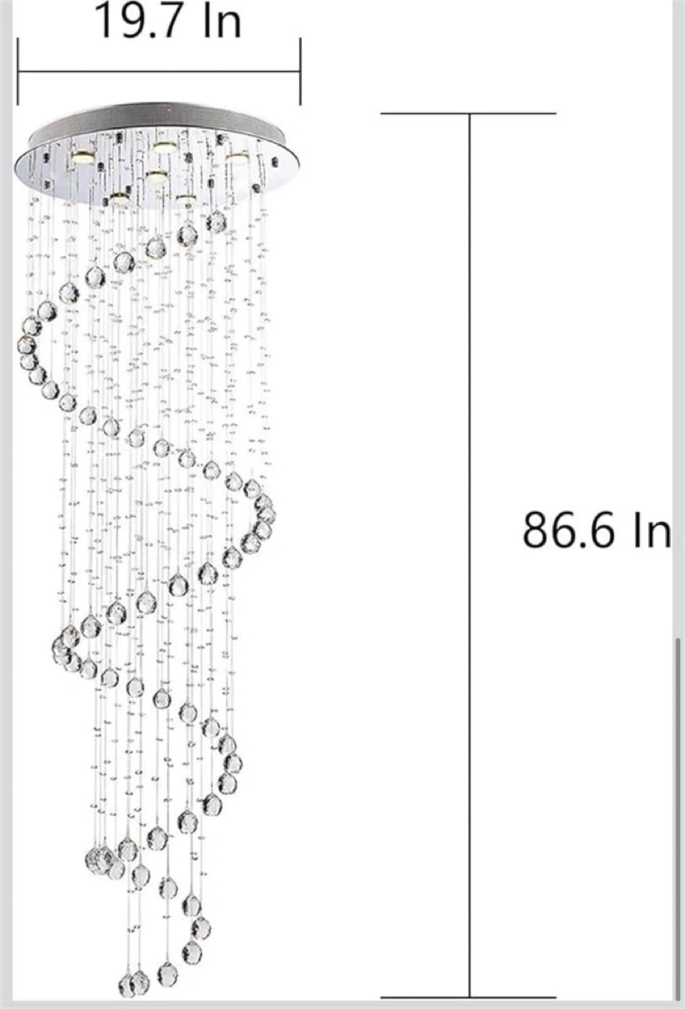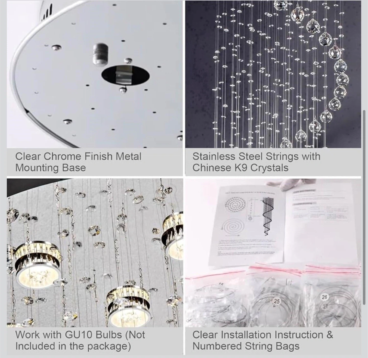 This stunning chandelier features a clear chrome finish metal mounting base and stainless steel strings with Chinese K9 crystals. It's designed to work with GU10 bulbs, not included. Includes clear installation instructions and numbered string bags.