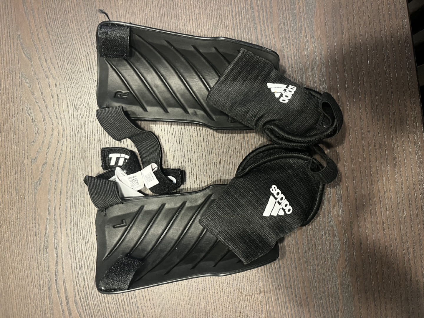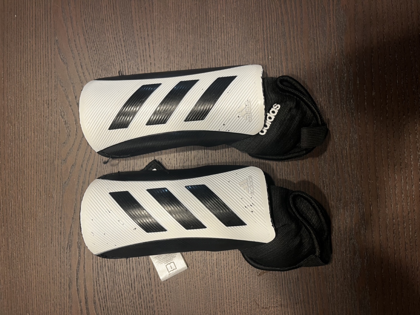 Pair of Adidas medium youth soccer shin guards. Includes protective shells and sock-like sleeves. Great for practice or games. Slightly used but recently washed