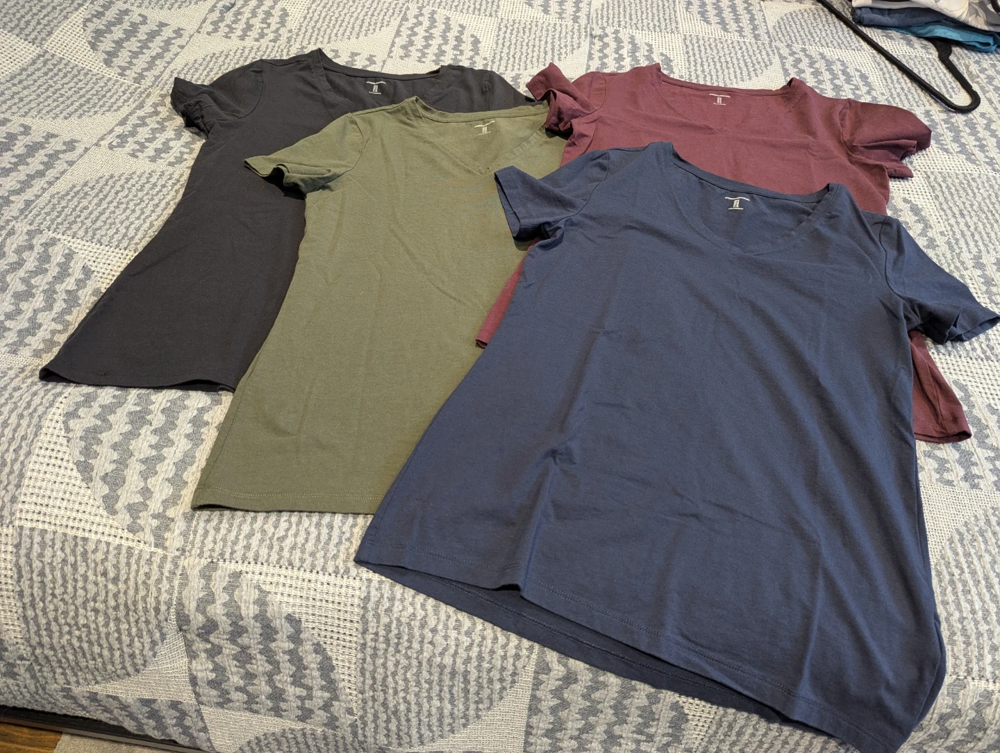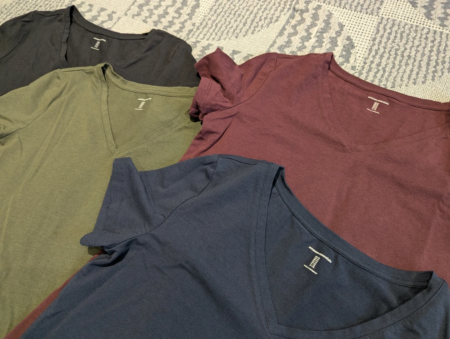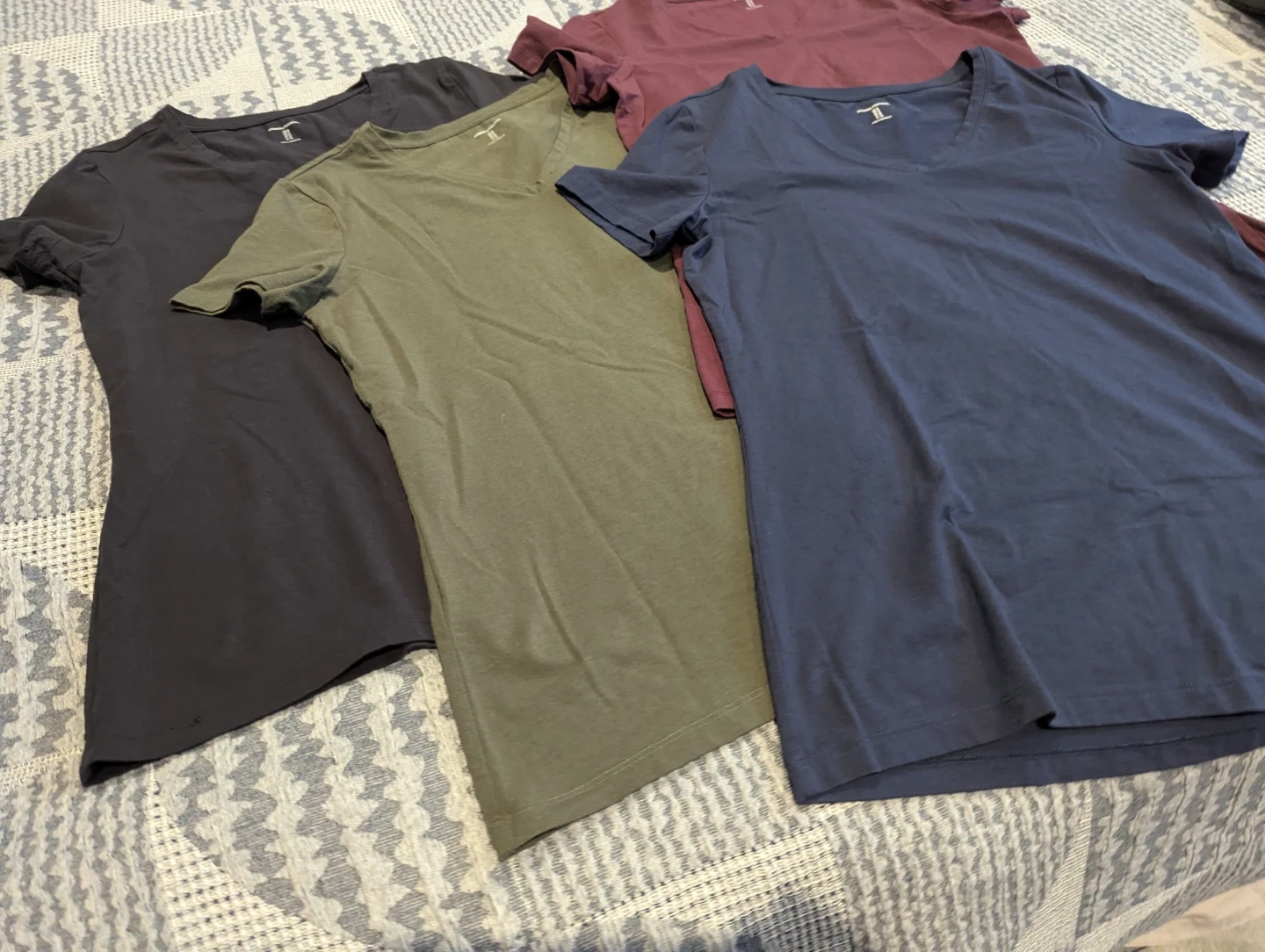 Four V-neck t-shirts in assorted colours: navy, olive, burgundy, and black.