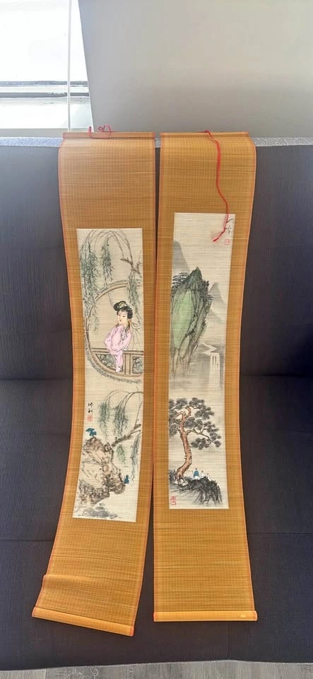 Beautiful set of 2 decorative scrolls with pretty Asian-inspired paintings. One scroll features a woman in traditional clothing, and the other displays a scenic landscape with mountains and a waterfall. Made with a woven material and includes red strings for hanging or tying.