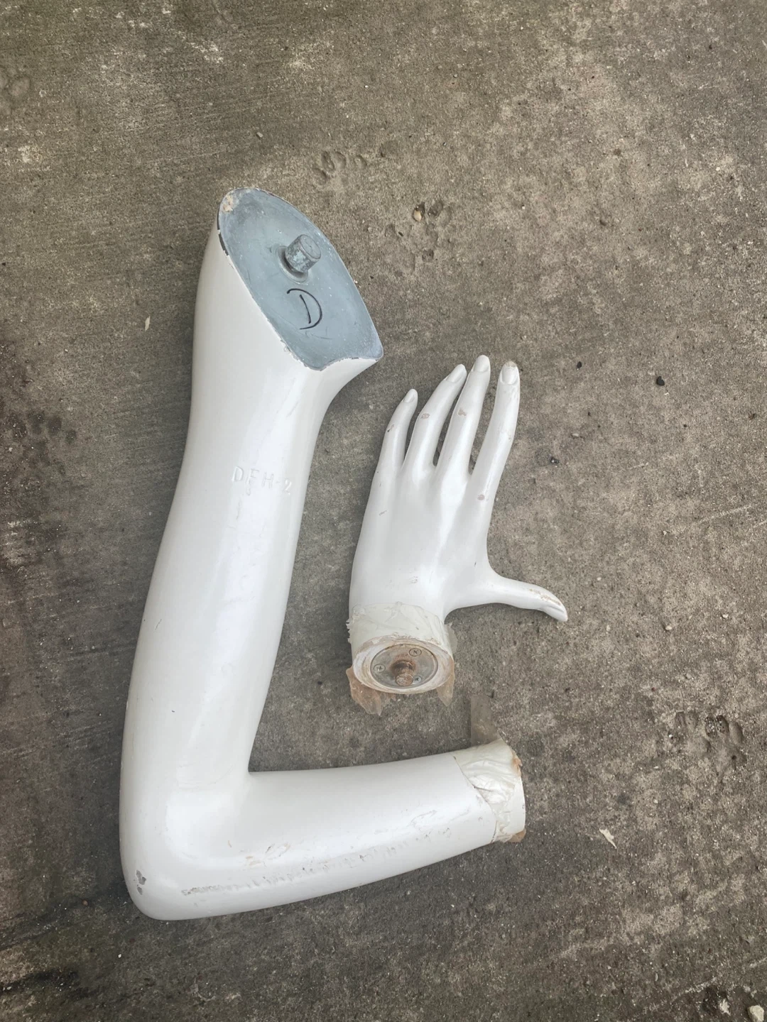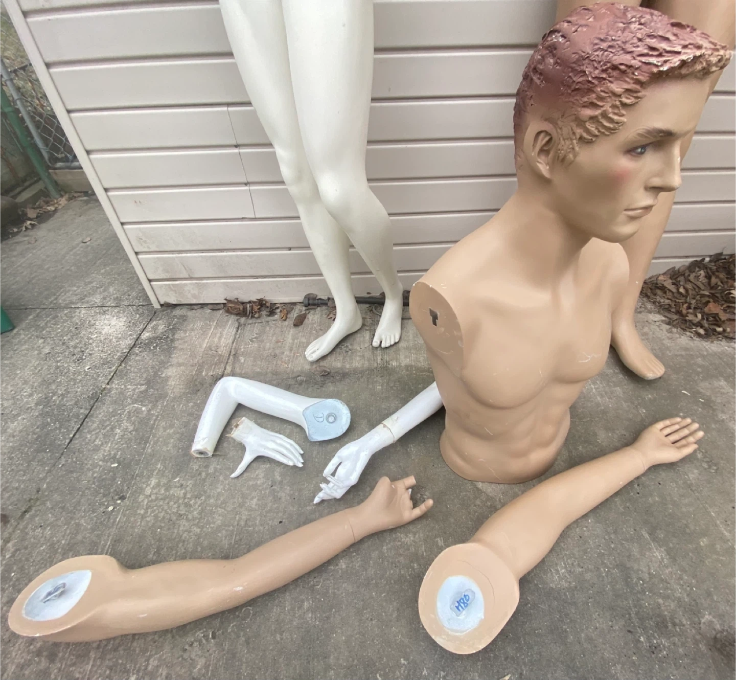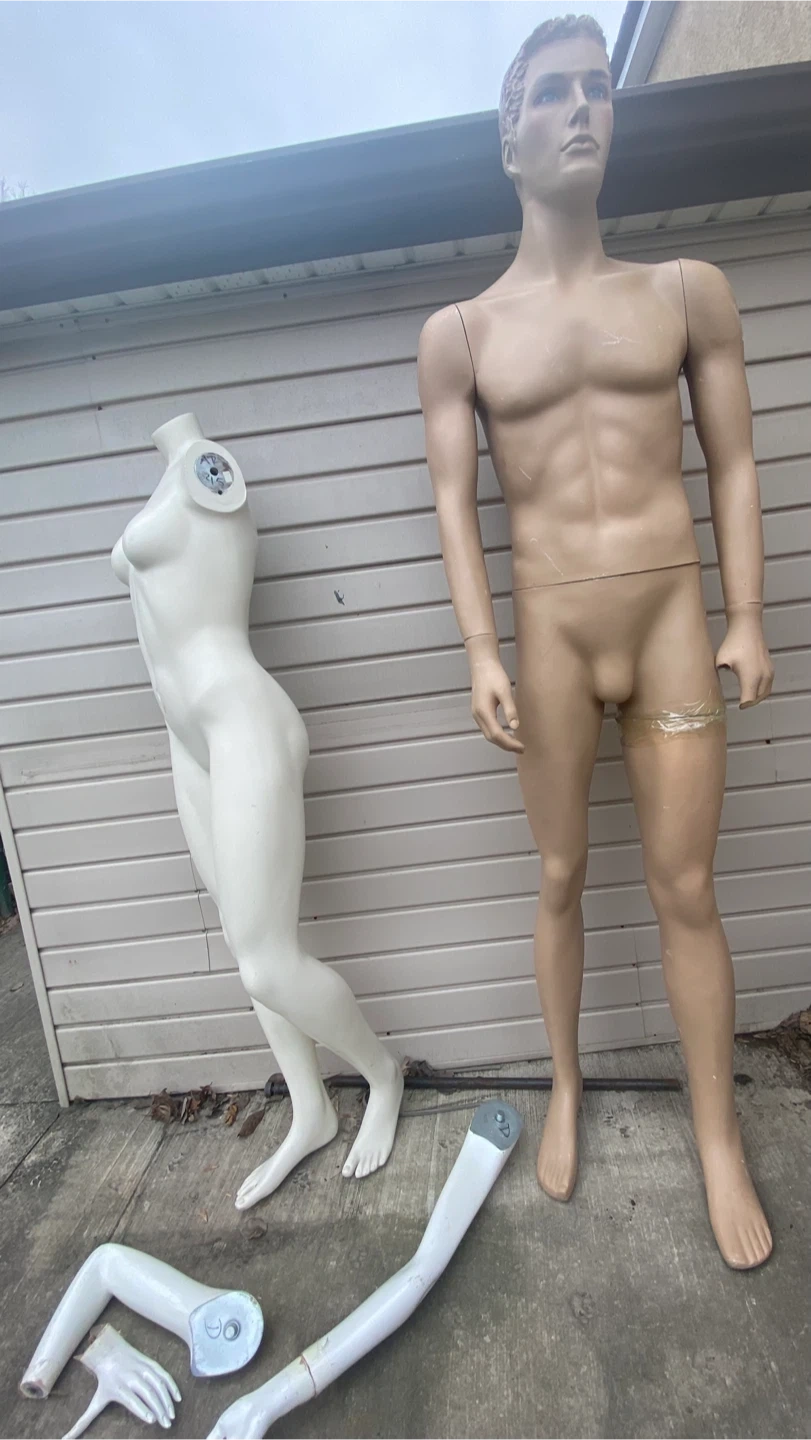 Includes a 2 piece male and a female body, plus detached arms and a hand. Mannequins are white and tan. Some pieces are taped together.