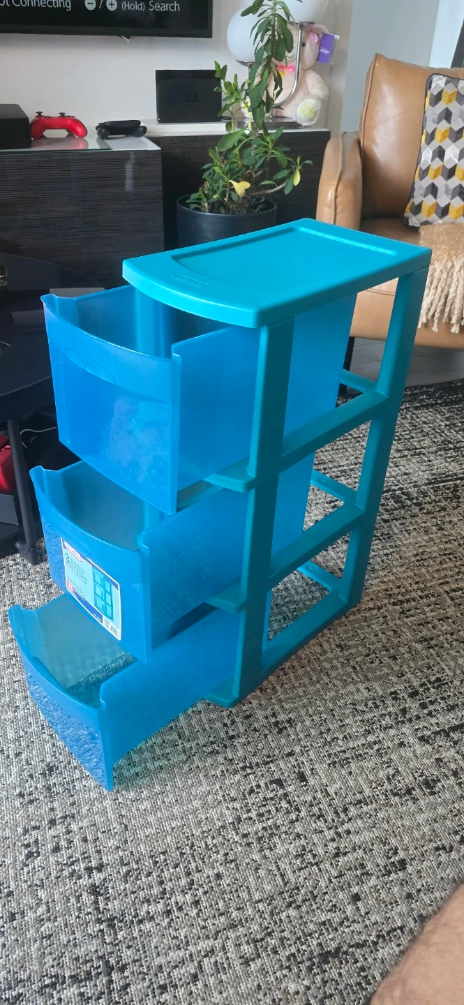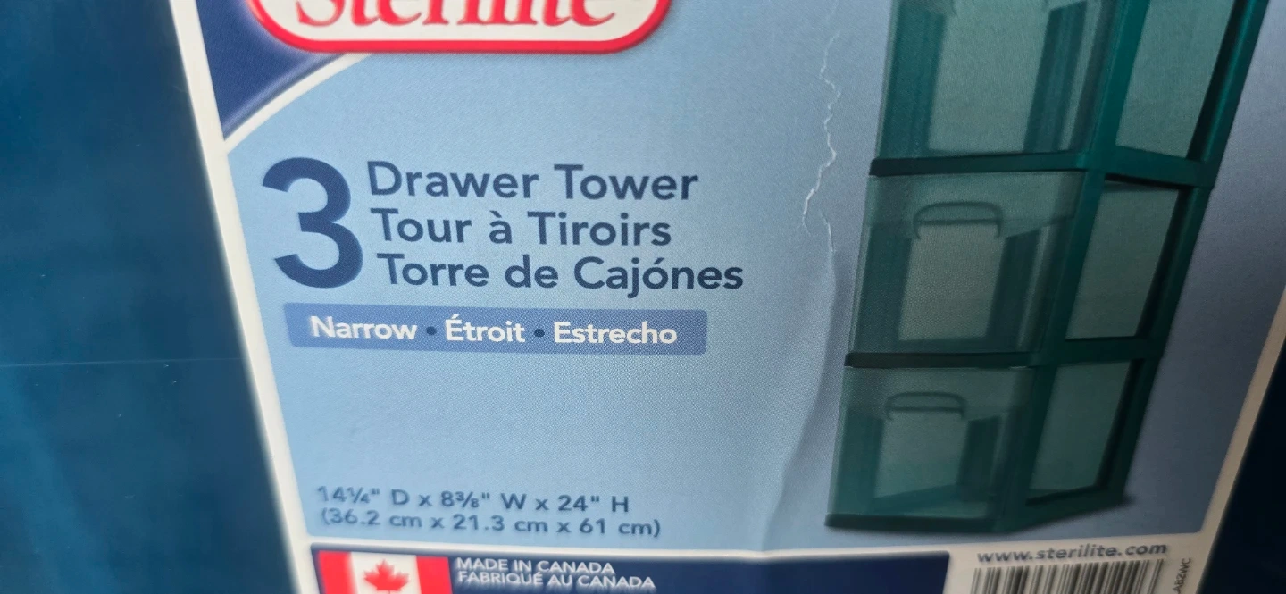 This Sterilite 3 drawer tower is a narrow unit, perfect for organizing small spaces. It's made of plastic and is a bright blue colour. Dimensions are 14.25" D x 8.38" W x 24" H.
