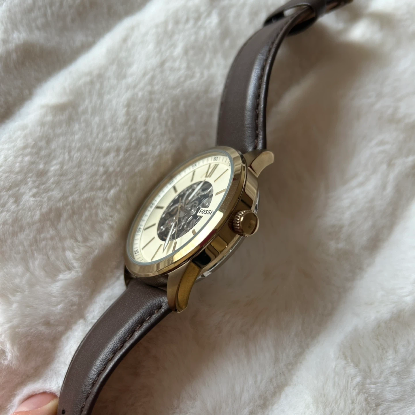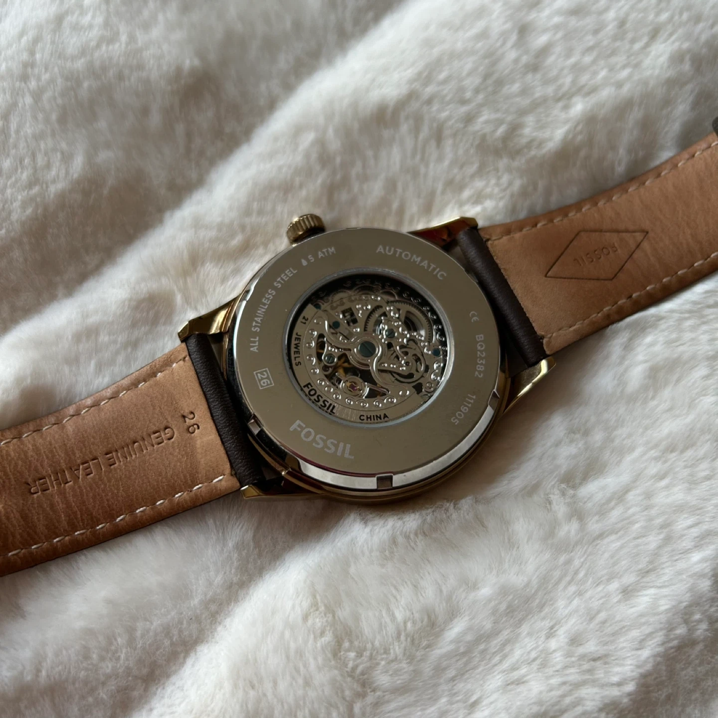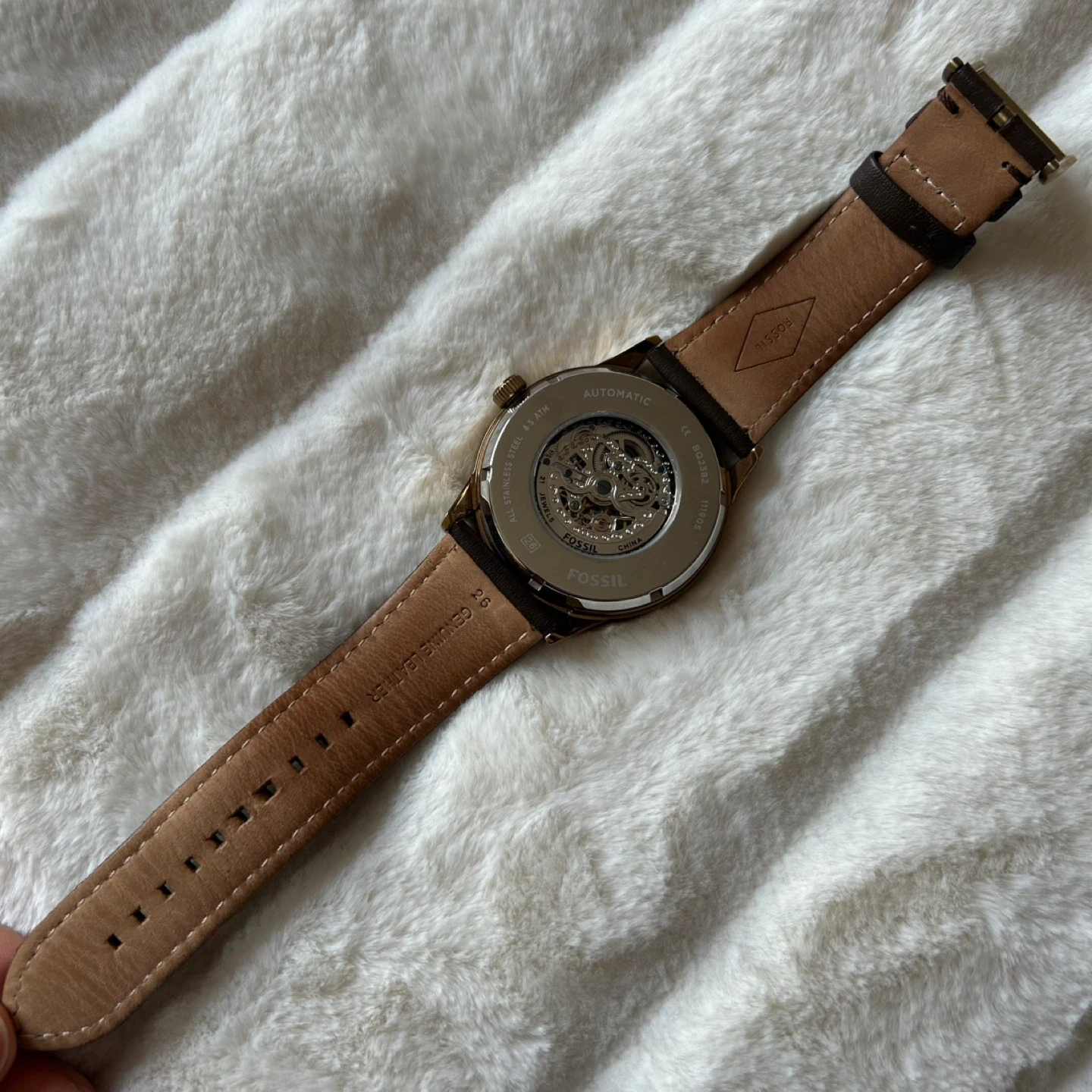 Fossil automatic watch with a skeleton dial. It features a brown leather band and a gold-tone case. This timepiece showcases an open-heart automatic movement.