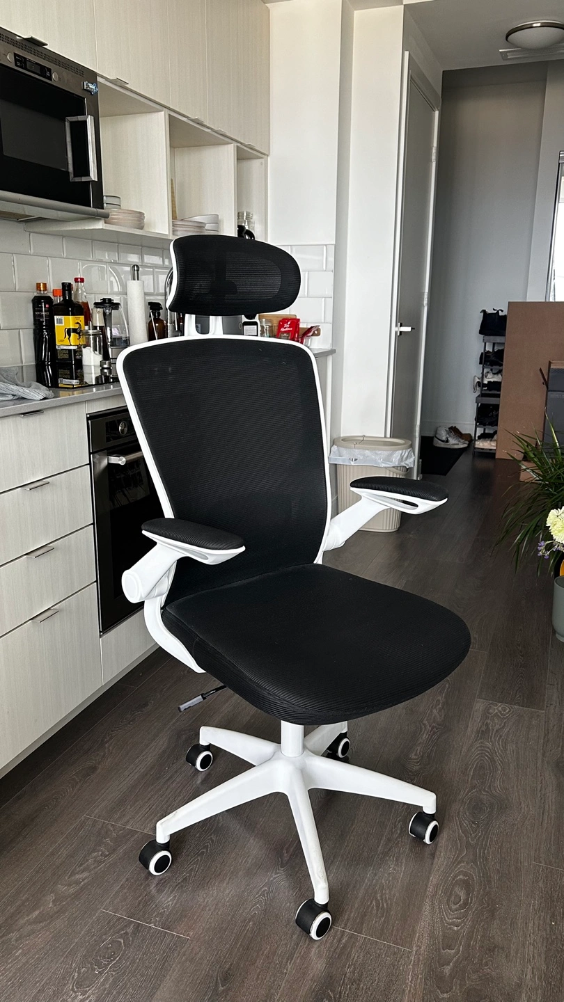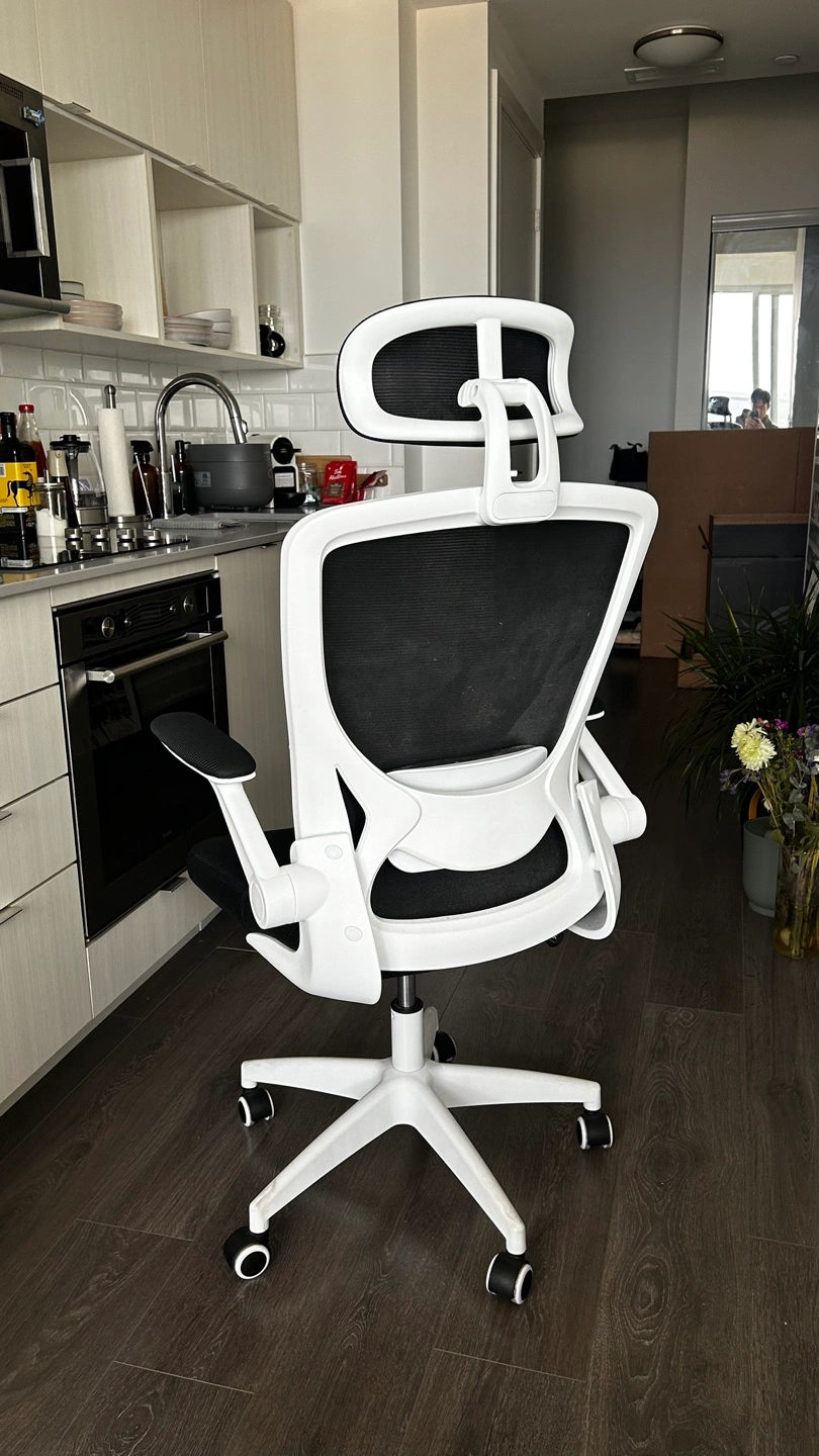 White and black office chair with headrest and armrests. Mesh back and seat. Five wheels.