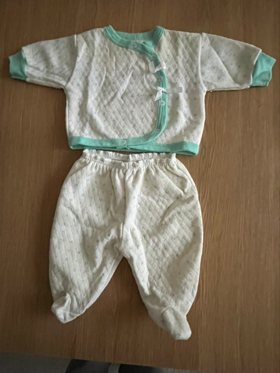 Infant 2-piece pyjamas set. White with green trim and white bows, long sleeve top and pants. Size 3-6 months. Made in Canada. In very good condition. If the ad is up, the item is available.