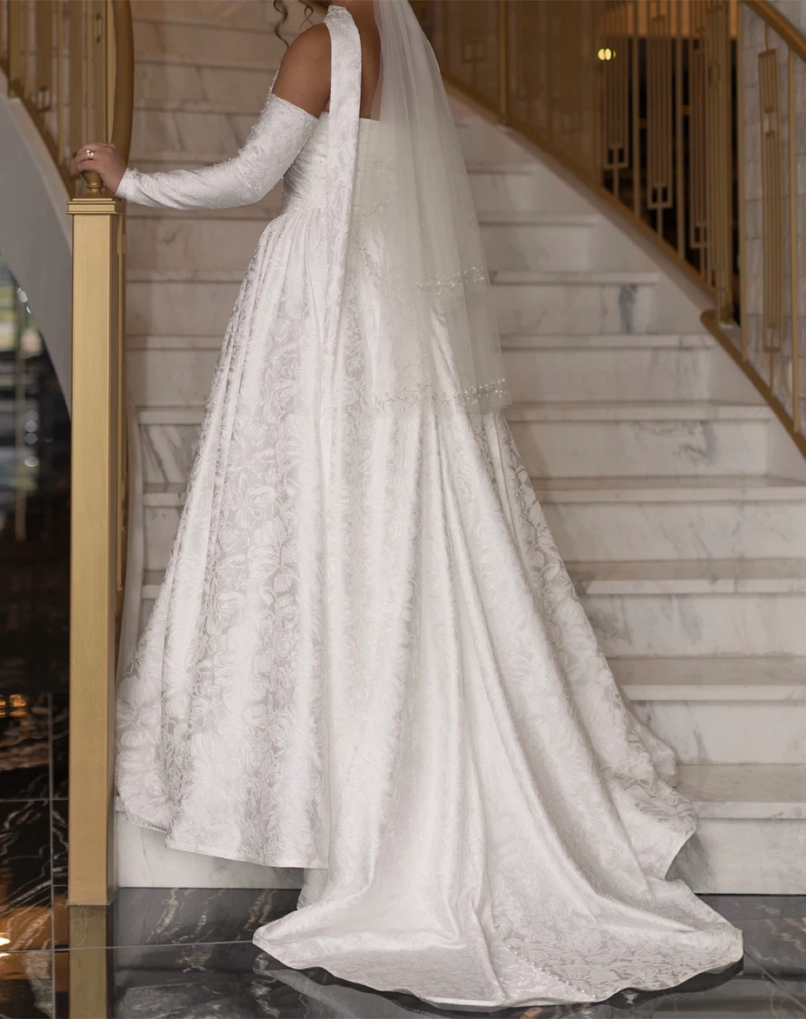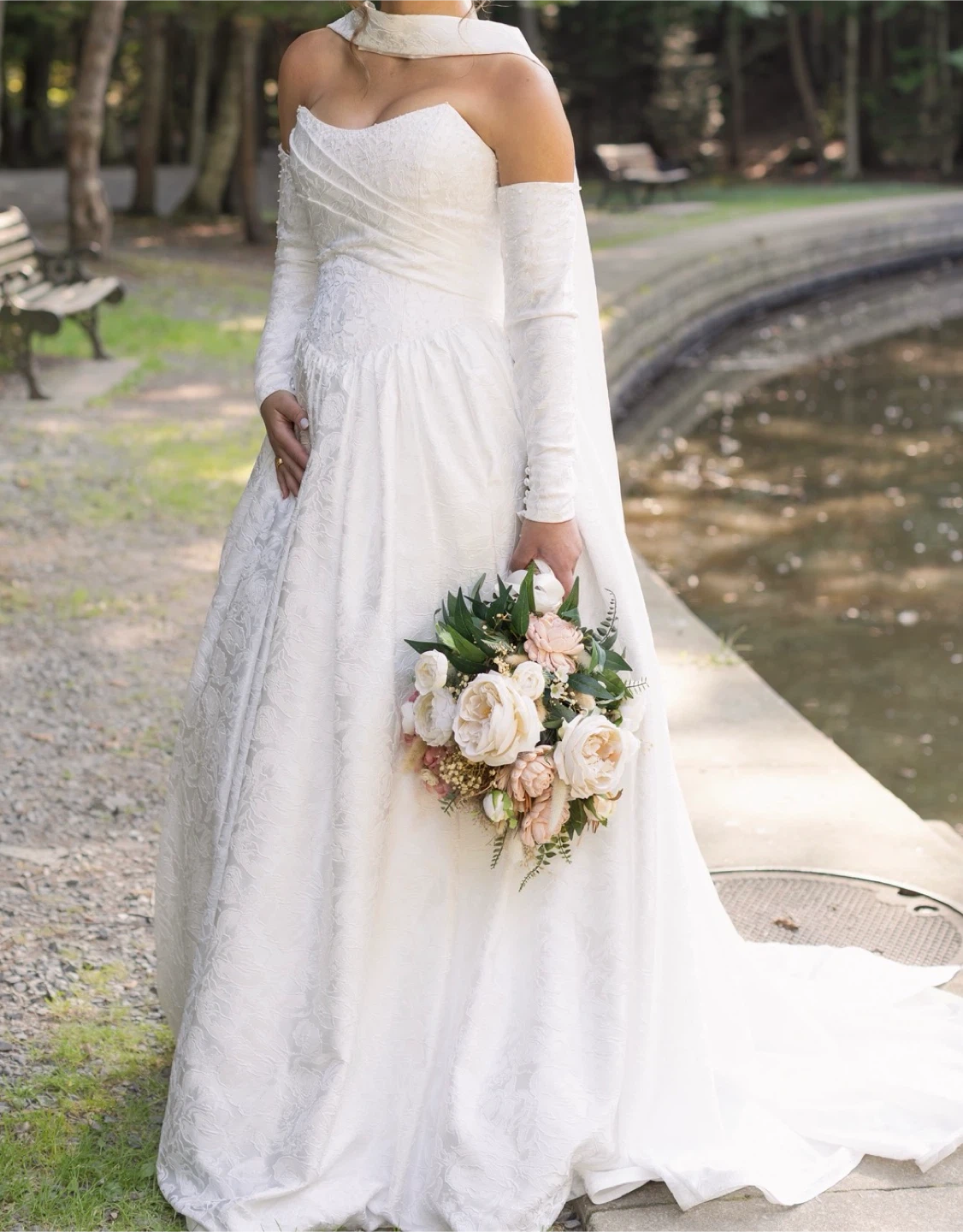Beautiful white wedding dress with intricate floral jacquard pattern. It features a strapless bodice with detachable long sleeves and a matching scarf. Train for a dramatic finish!