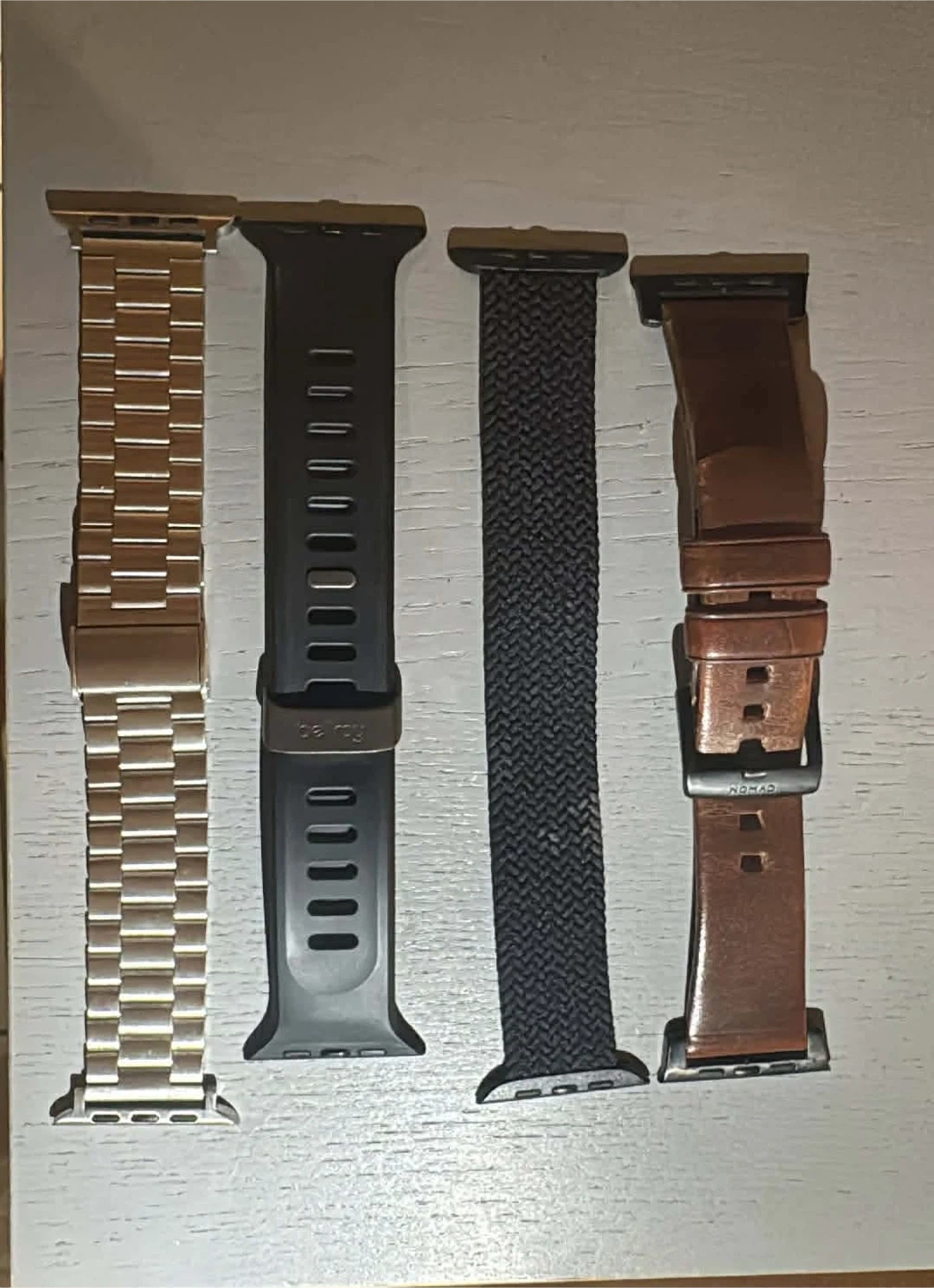 Variety of Apple Watch bands including Bellroy Venture in Large (Shadow), Pitaka carbon fibre, and Nomad leather. Bands fit 42-49mm Apple Watch.