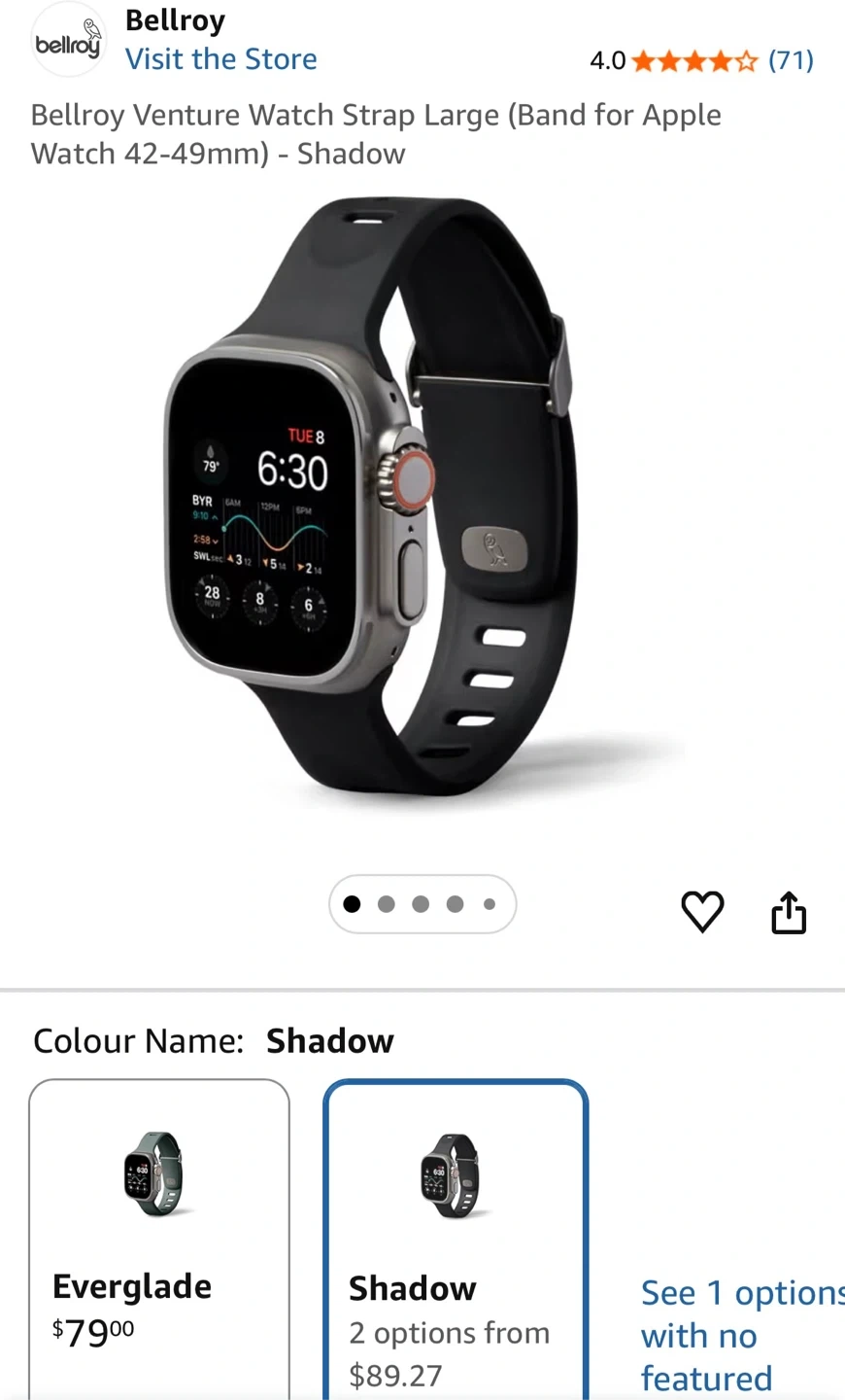 Variety of Apple Watch bands including Bellroy Venture in Large (Shadow), Pitaka carbon fibre, and Nomad leather. Bands fit 42-49mm Apple Watch.