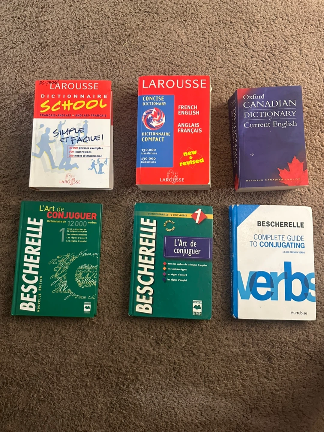 This lot includes several language learning books. There are French-English dictionaries from Larousse and an Oxford Canadian Dictionary. It also features Bescherelle guides for French verb conjugation. These books are great for students or anyone learning French or improving their English.