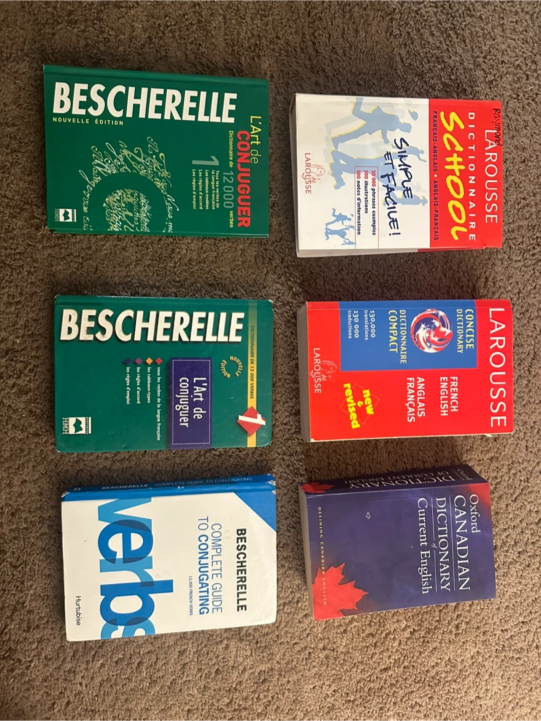 This lot includes several language learning books. There are French-English dictionaries from Larousse and an Oxford Canadian Dictionary. It also features Bescherelle guides for French verb conjugation. These books are great for students or anyone learning French or improving their English.