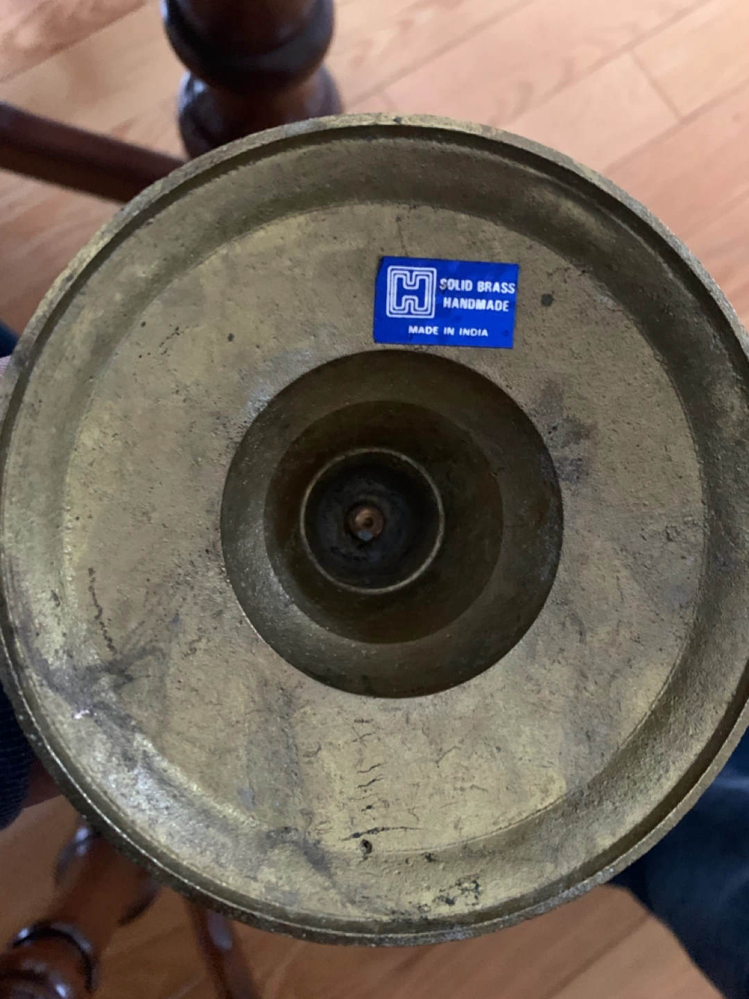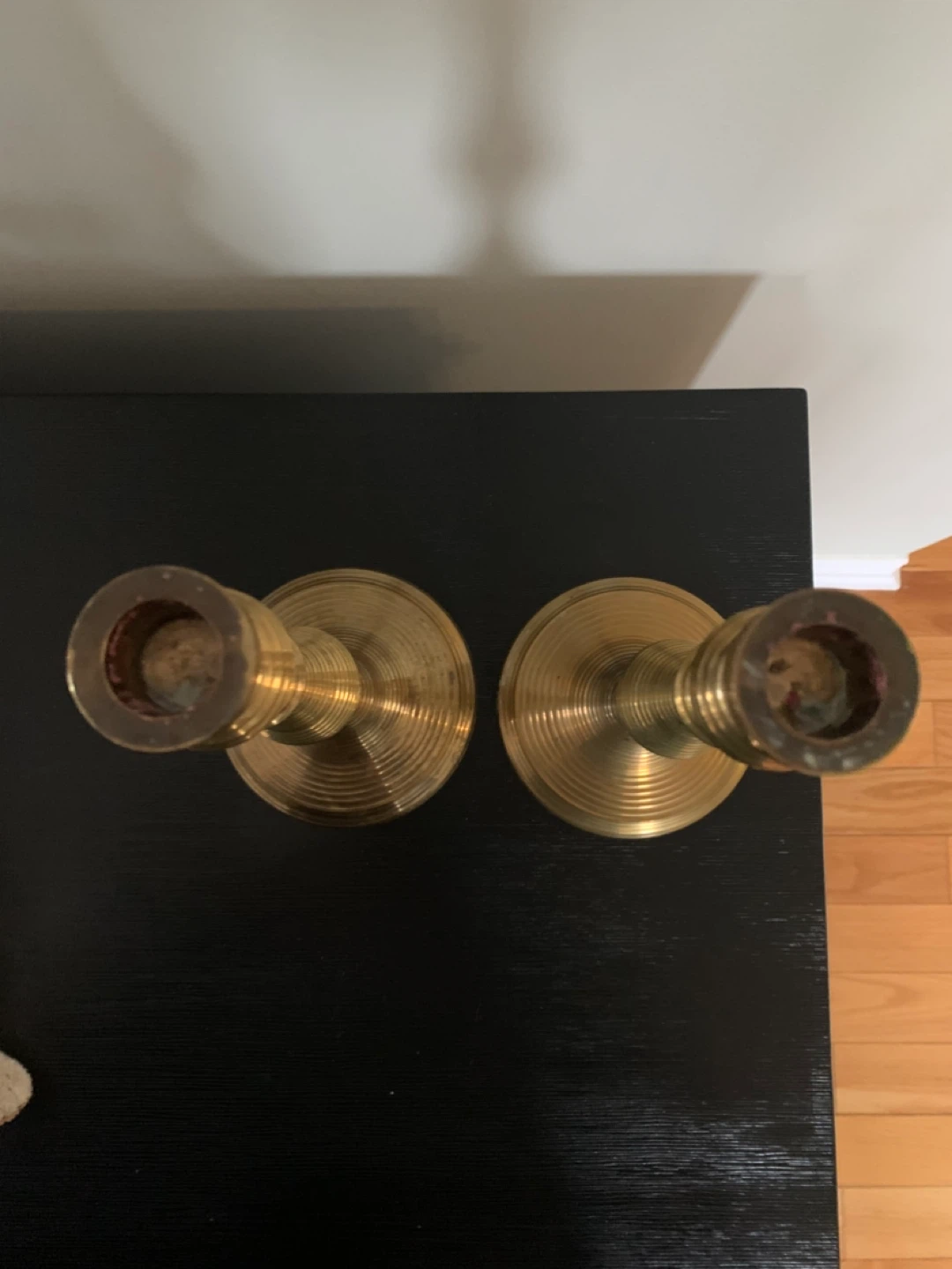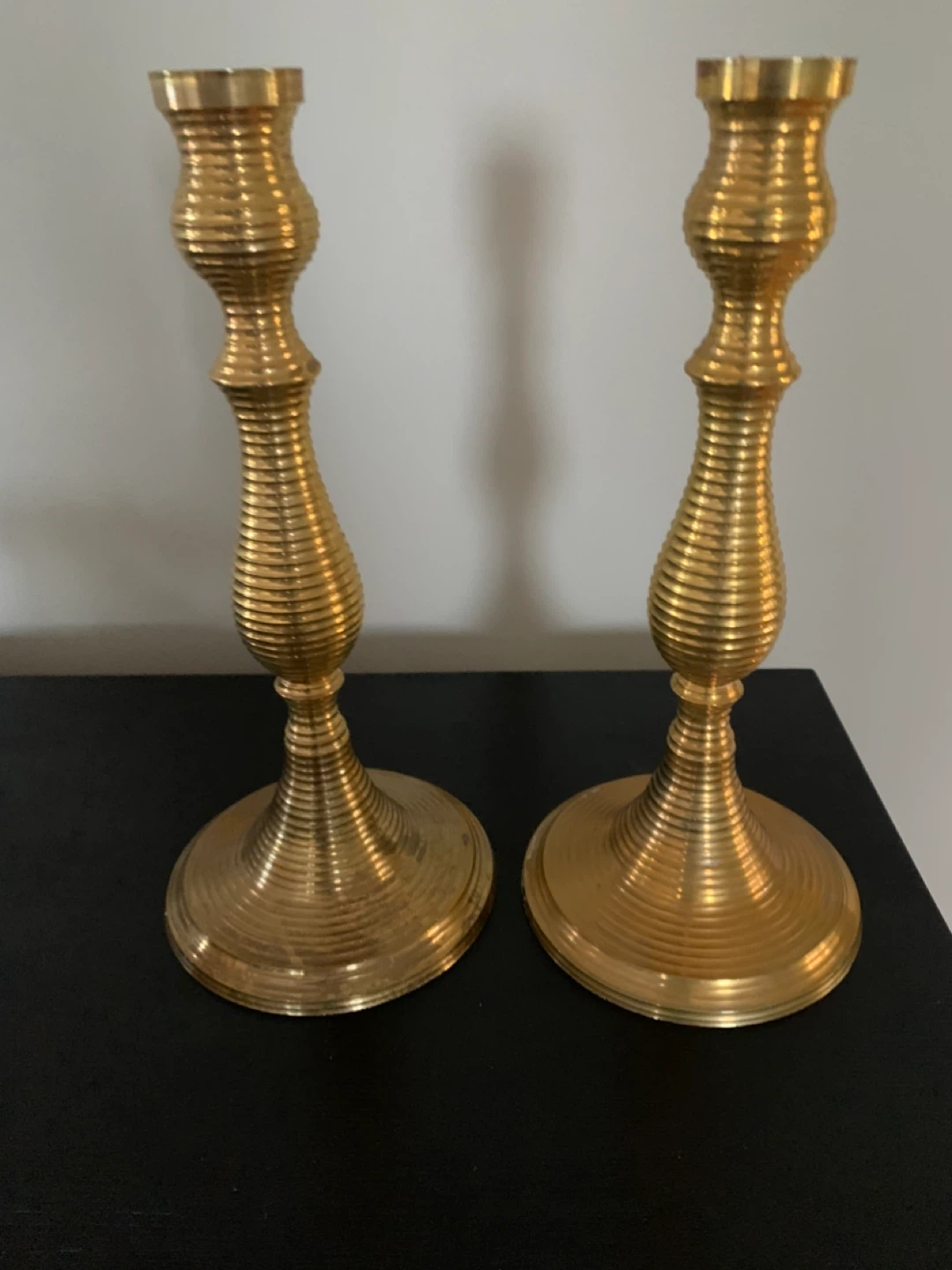 Selling a pair of solid brass candlestick holders. They are handmade and have a beautiful golden colour. They have some signs of use, but are in good condition overall!