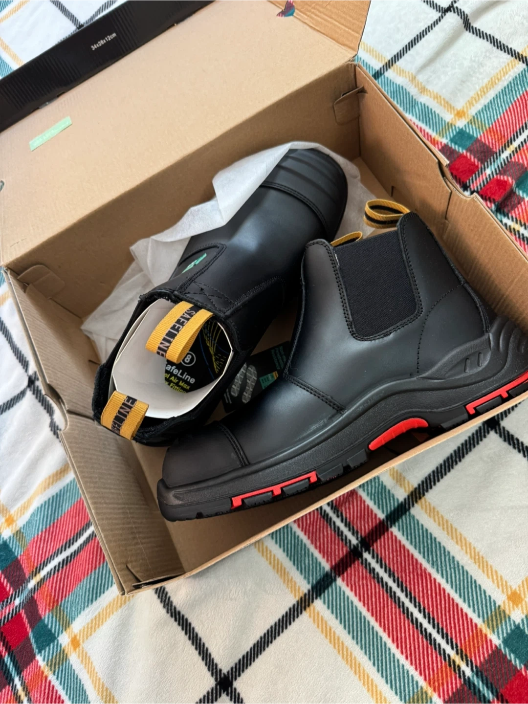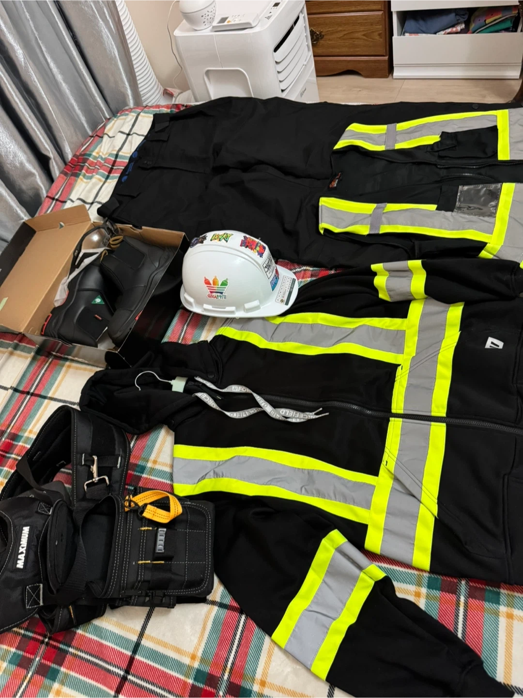 This bundle includes black steel-toed work boots (size 8:NEW), a utility harness/belt with pouch—NEW, reflective jacket and vest—worn twice, and hard hat—worn twice. Stormpack snow pant—size L—worn twice.Safety glasses are also included.