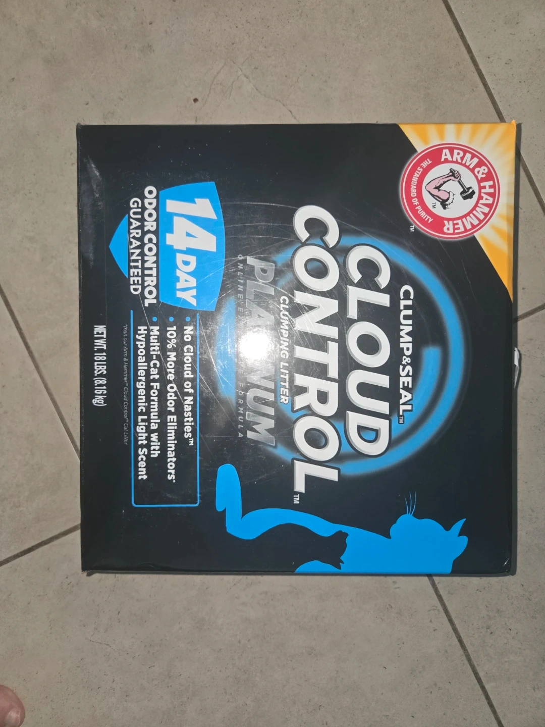 Selling a box of Arm & Hammer Clump & Seal Cloud Control Platinum cat litter. It offers 14-day odor control guaranteed and is a multi-cat formula with hypoallergenic light scent. It also eliminates 10% more odor from nasties. Net weight: 18 lbs (8.16 kg)