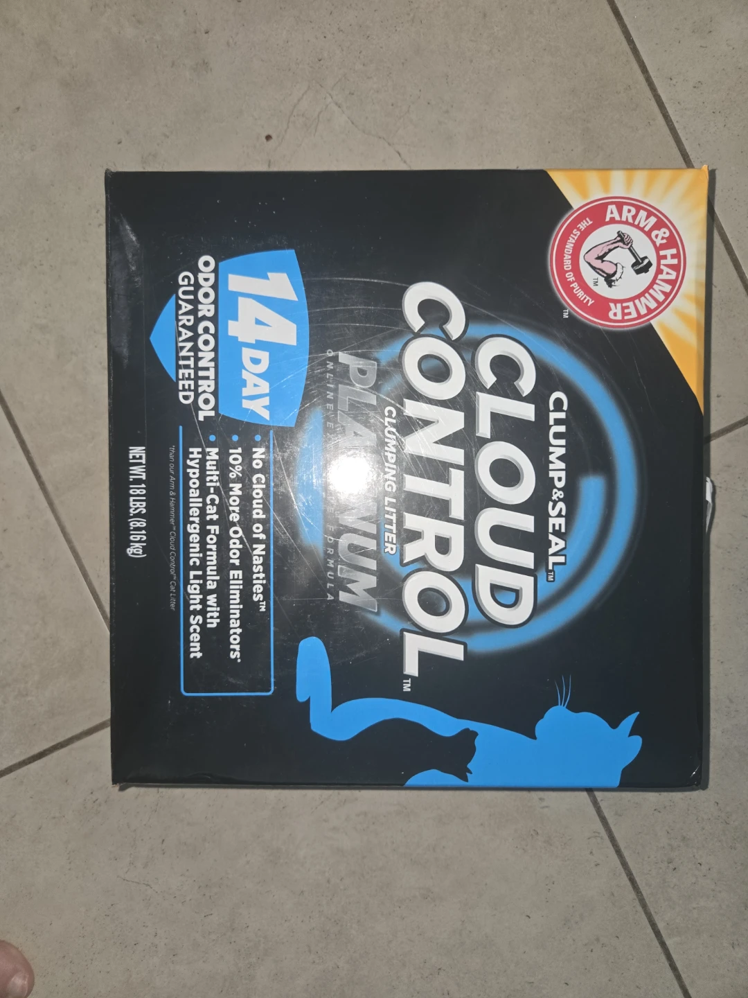 Selling a box of Arm & Hammer Clump & Seal Cloud Control Platinum cat litter. It offers 14-day odor control guaranteed and is a multi-cat formula with hypoallergenic light scent. It also eliminates 10% more odor from nasties. Net weight: 18 lbs (8.16 kg)