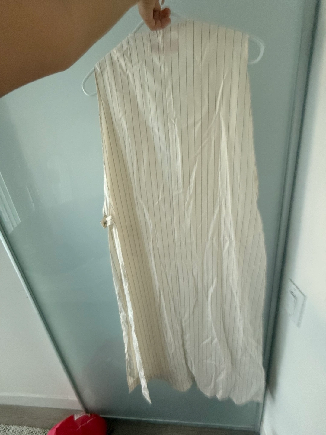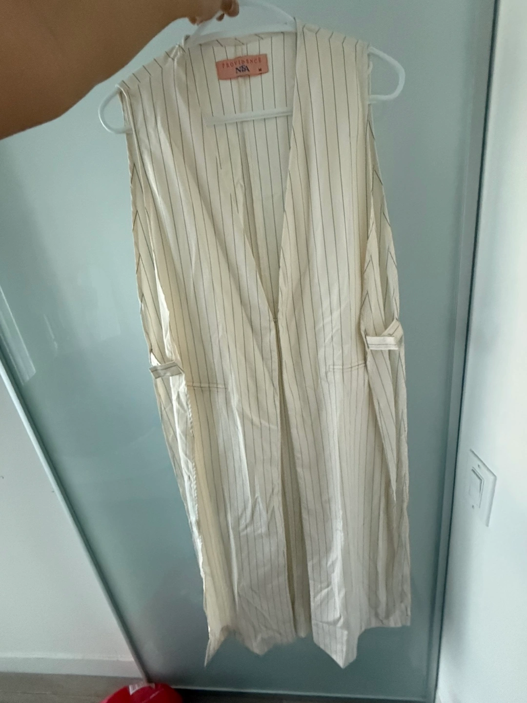 Long sleeveless vest. Cream coloured with thin brown stripes. V-neck. Side slits. Lightweight fabric.