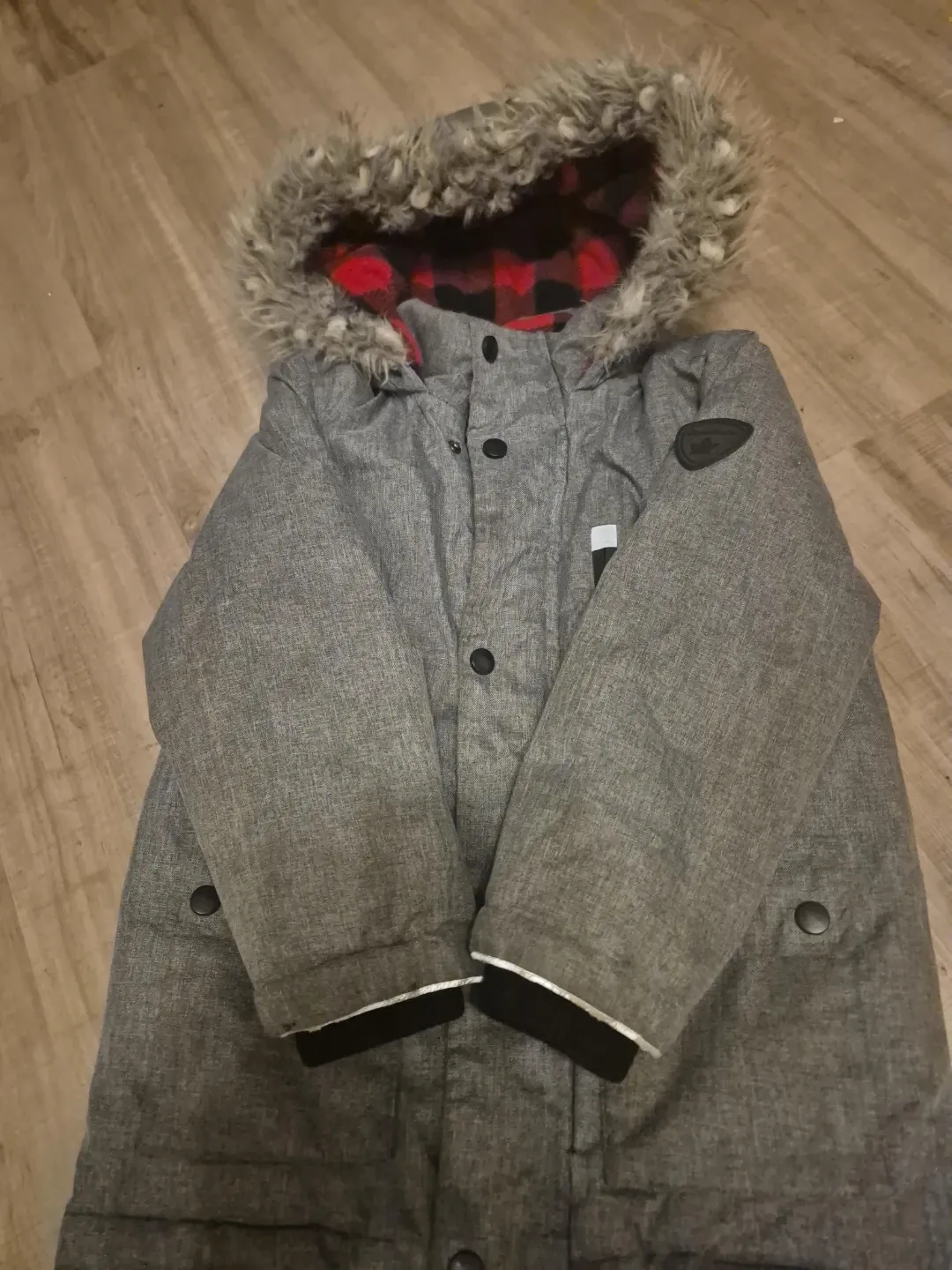 This boys' parka jacket is grey with a cozy red and black plaid lining. It features a faux fur-trimmed hood and black cuffs with a silver stripe. Great for keeping warm on chilly days!