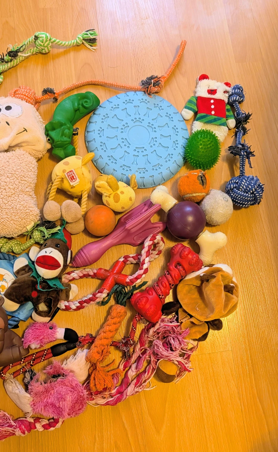 A big collection of durable dog toys including ropes, plush toys, balls, and chew toys. Features various textures and sizes for different play styles. Great for fetching, tugging, and chewing!