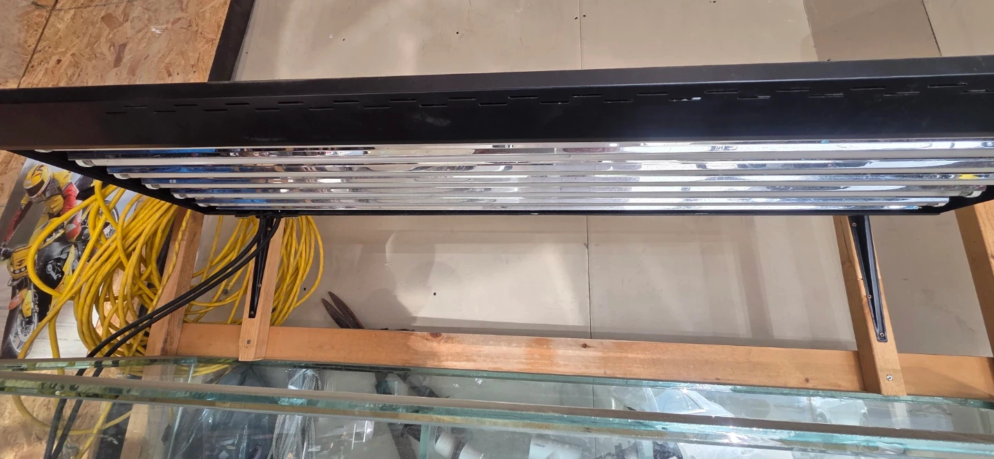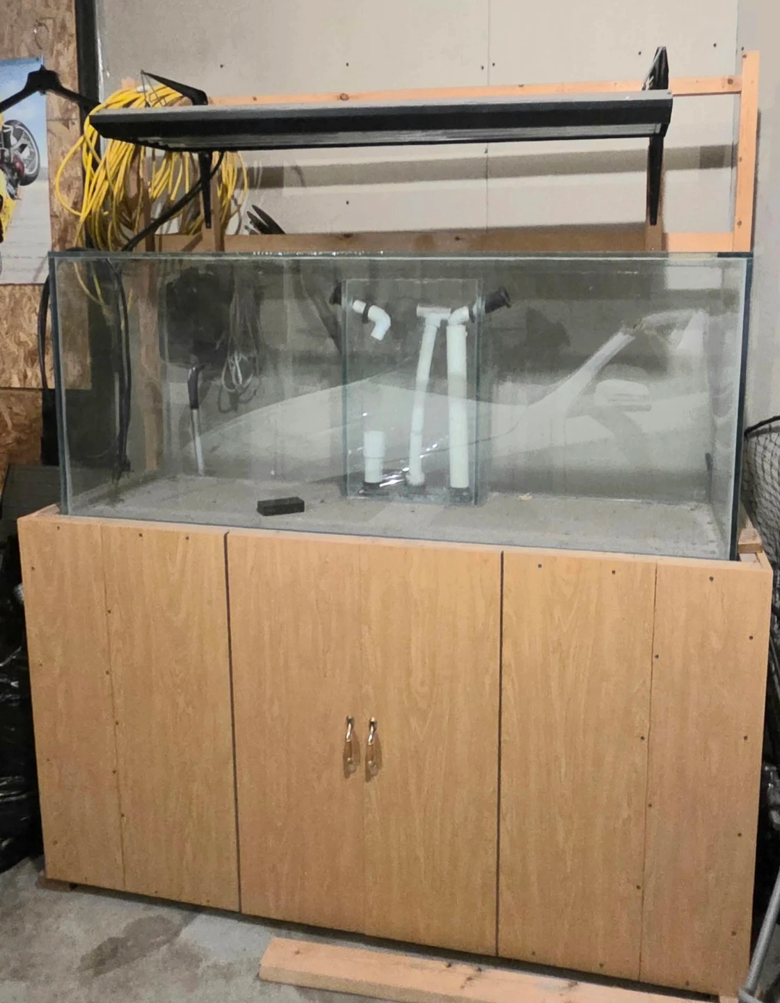 This is a large glass aquarium set up on a wooden cabinet. It includes a fluorescent light fixture. A few plumbing components are visible inside the tank and in the cabinet.