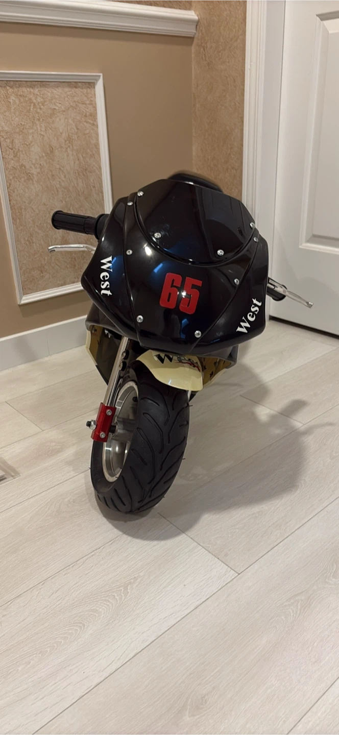 A fun pocket bike with a Honda-inspired design. It includes a fuel bottle and a manual and tools. Engine never ran or touched a road. Best as a display item. If you want to it to run it will need a new gas tank and front tire. Open to trades as well